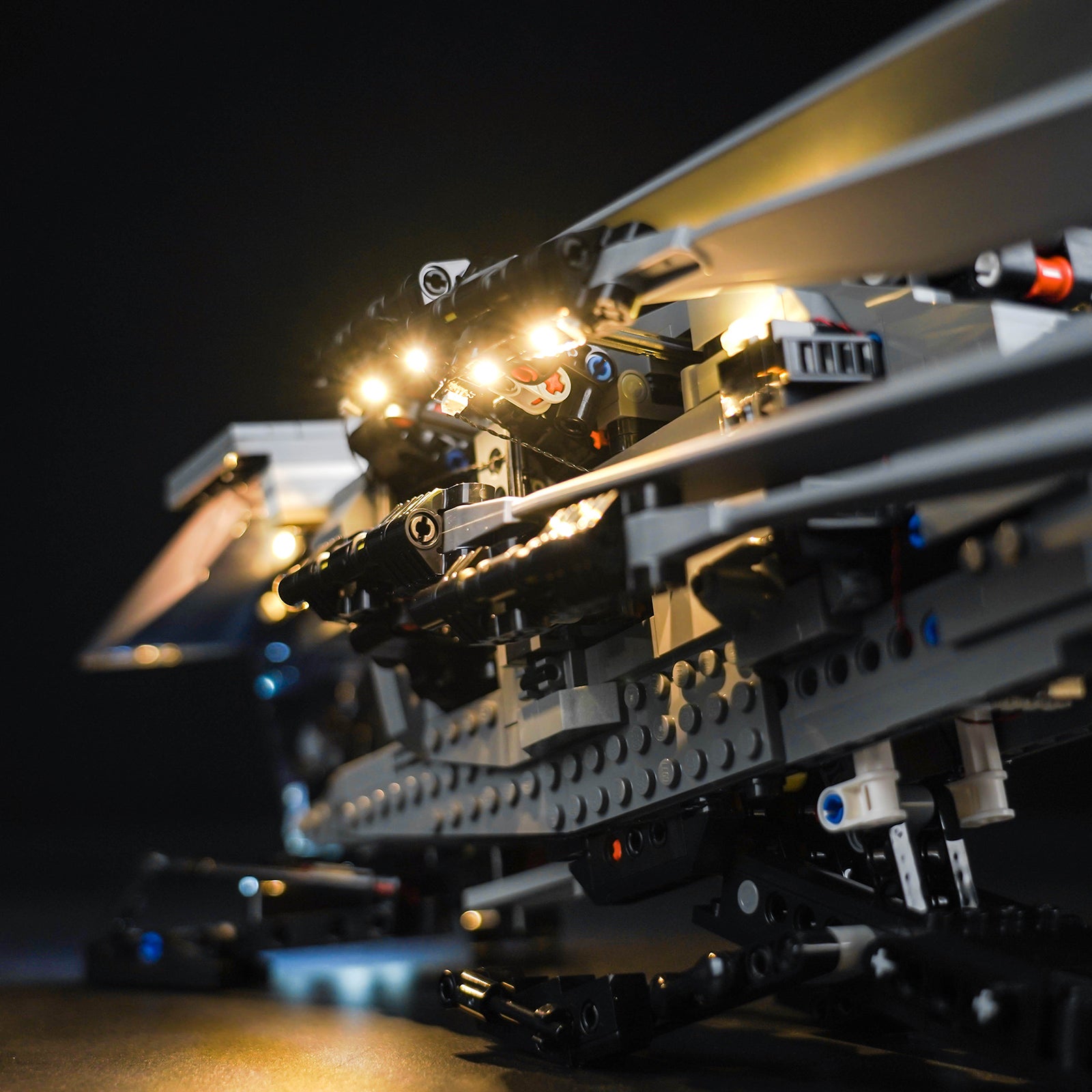 With BrickBling's advanced LED technology, the LEGO Atreides Royal Ornithopter casts a spellbinding glow that captivates all who behold its beauty. The warm light in the cockpit makes the pilot appear faintly, which is very cool. The white LED in the front simulates the weapon system of the laser array and the tail fin is dotted with 2 red LEDs. Every detail of the entire model is illuminated, greatly improving the viewing experience.