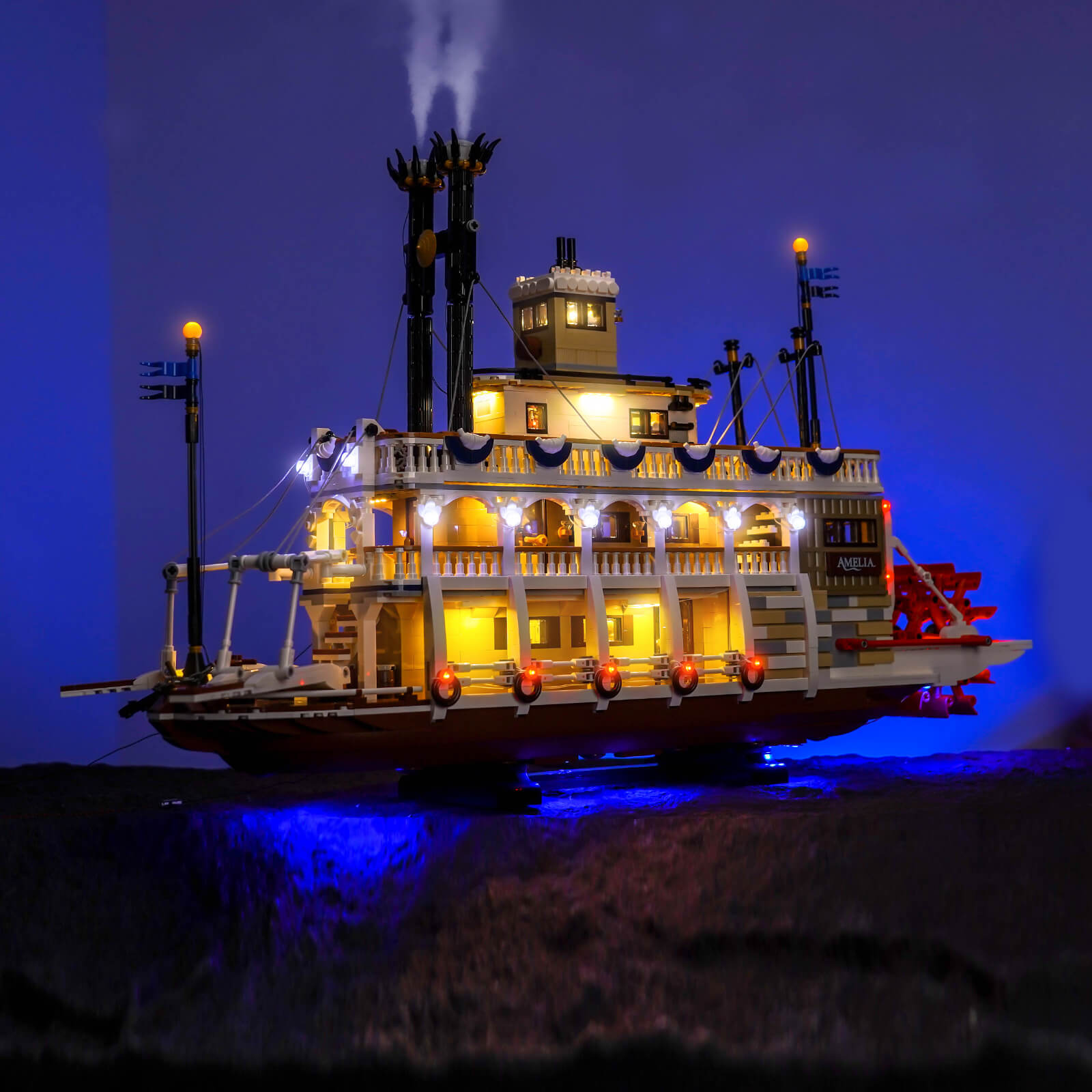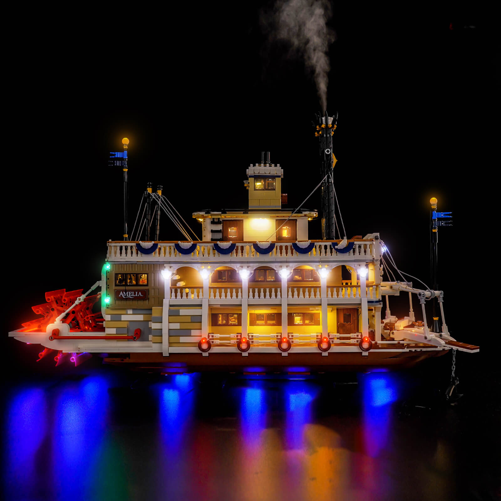 The BrickBling lighting kit injects soul light into LEGO® Ideas River Steamboat 21356, a tribute to the enduring charm of classic paddle steamers with a touch of modern luxury.