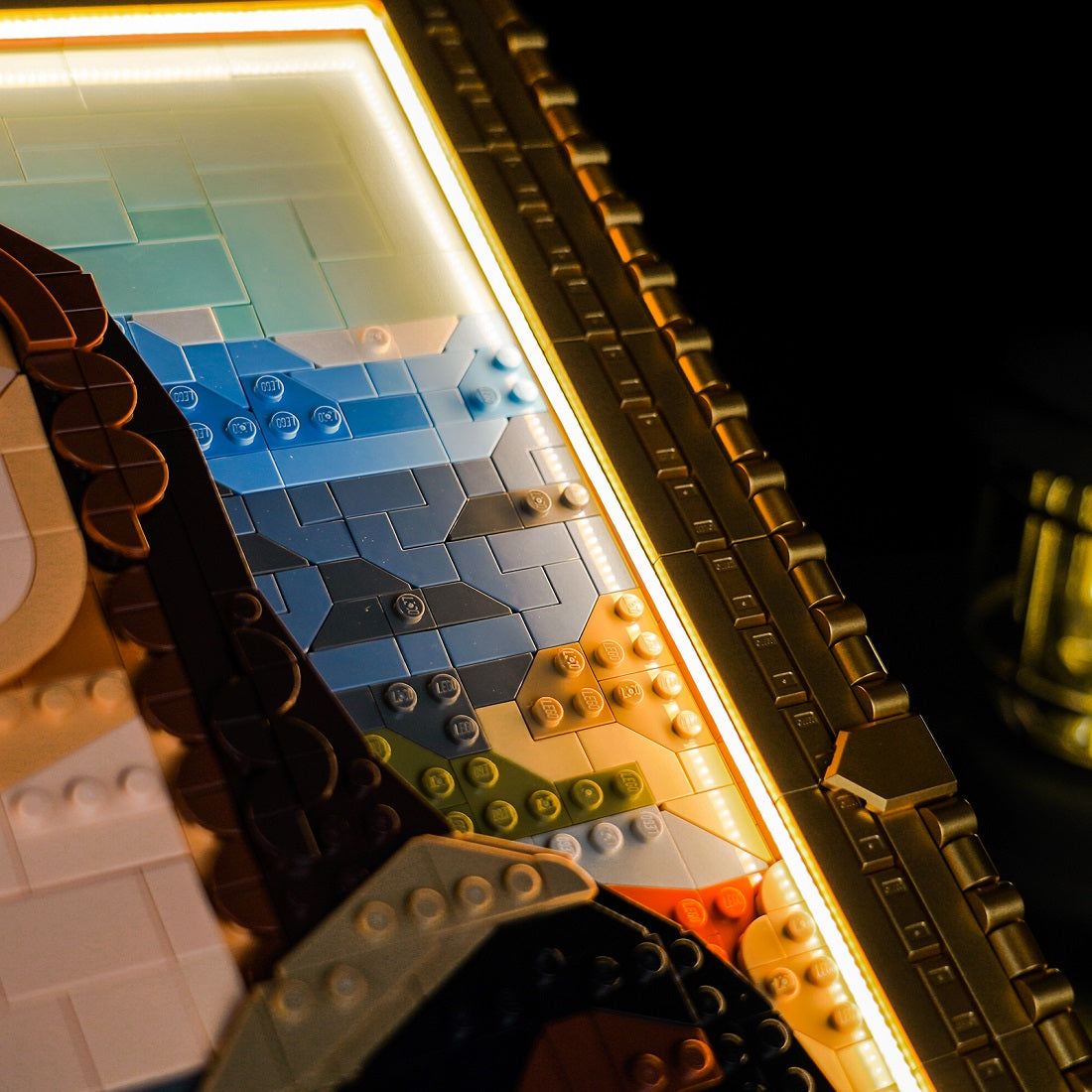 The LED lighting kit adds a series of warm white light strips to the border of the LEGO Art Mona Lisa 31213, bringing new brilliance to this LEGO art.
