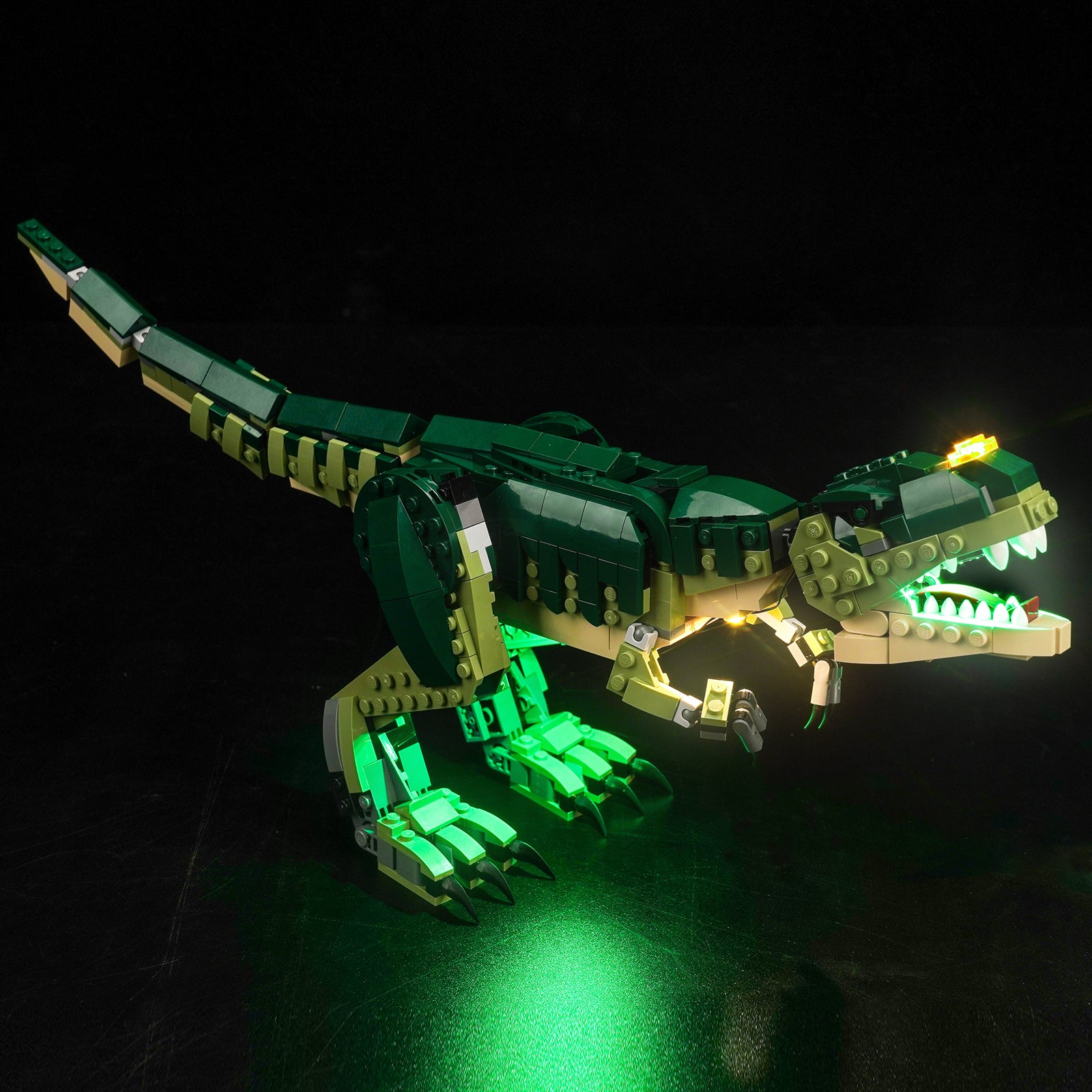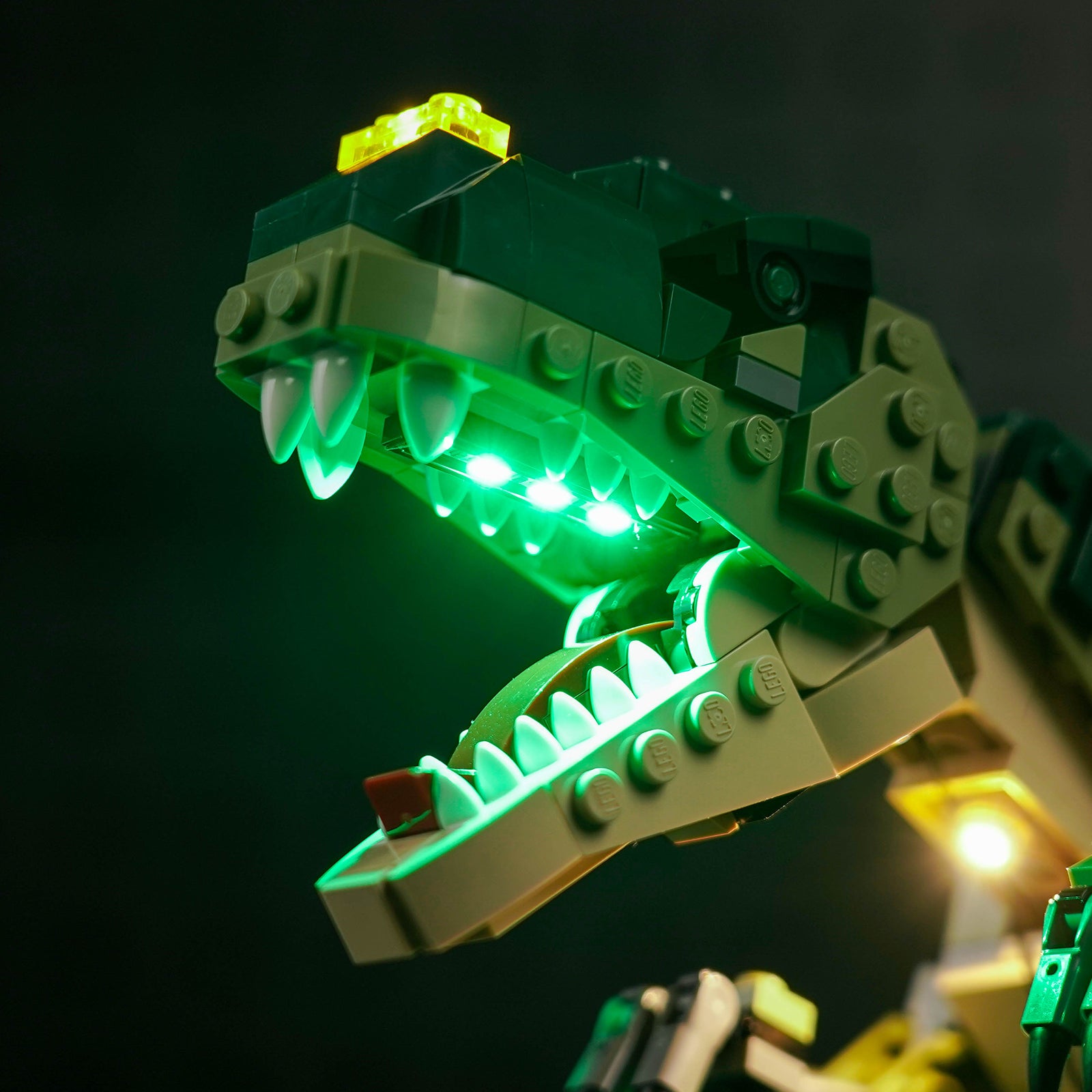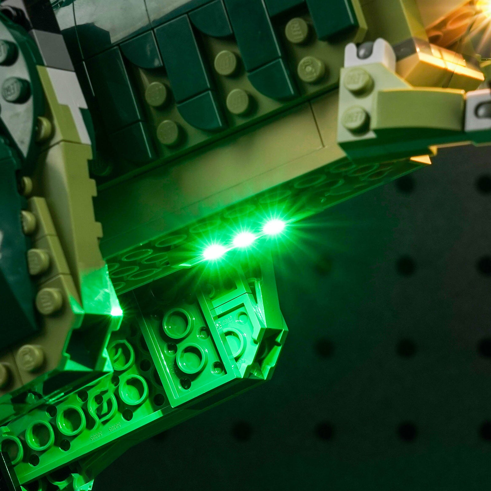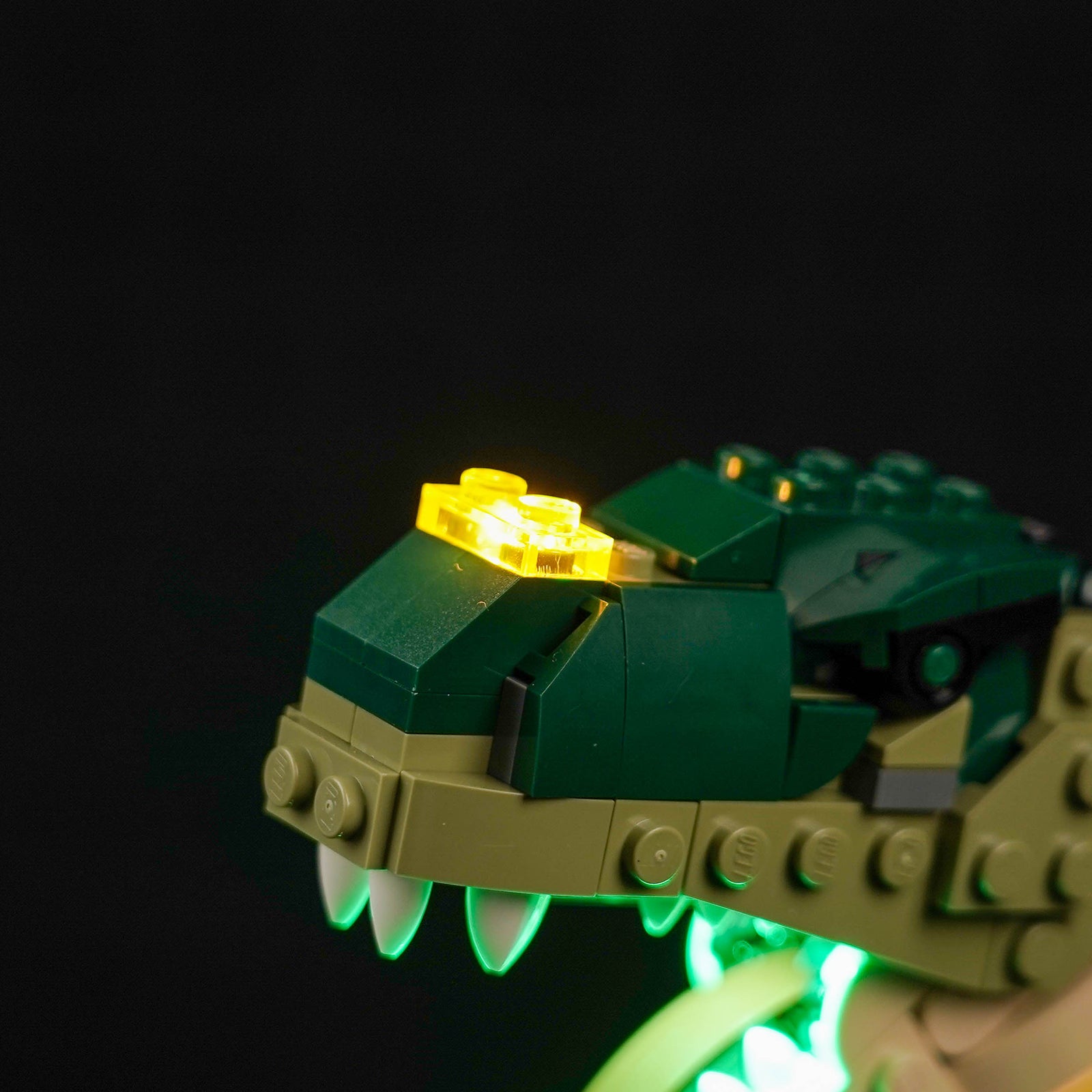 We creatively placed green and yellow LEDs on the forehead, mouth, neck and abdomen of the Tyrannosaurus Rex, highlighting the sharp teeth and huge body of the Tyrannosaurus Rex, creating a dangerous jungle atmosphere. The light line layout is simple, which is very suitable for LEGO novices and children.