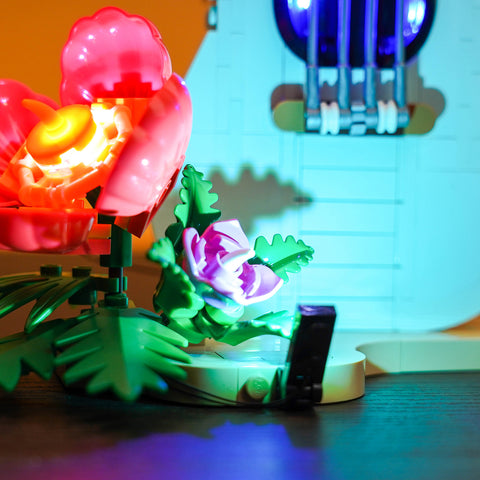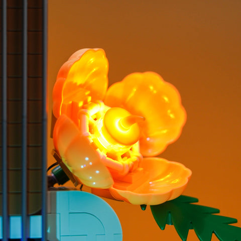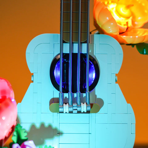 Our carefully selected LEDs bring to life the tropical charm of the ukulele and its vibrant surroundings. Picture the soft glow accentuating the colorful flowers, and the ukulele itself, with its four moving and vibrating plastic strings, becomes a mesmerizing instrument under the enchanting brilliance of BrickBling lights.