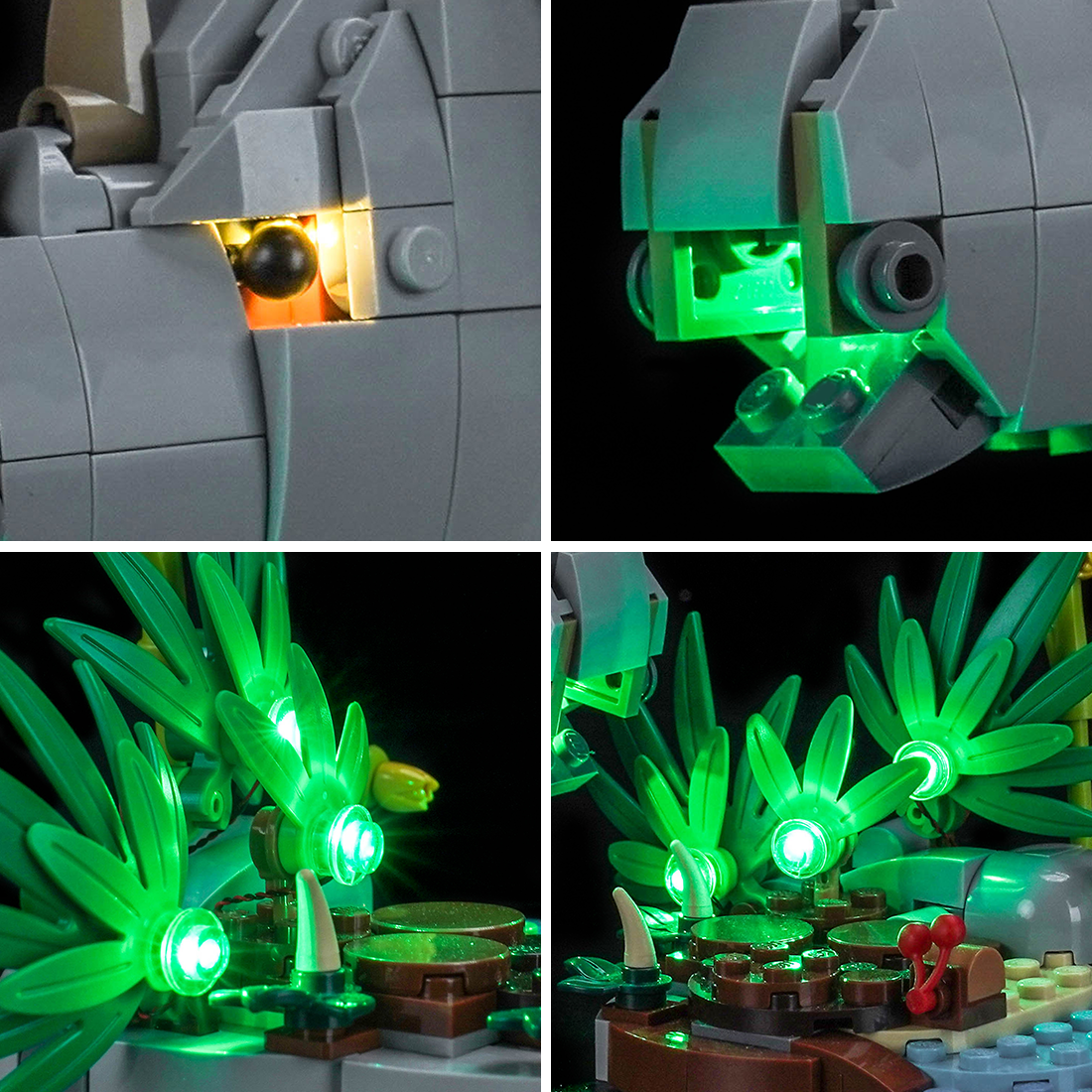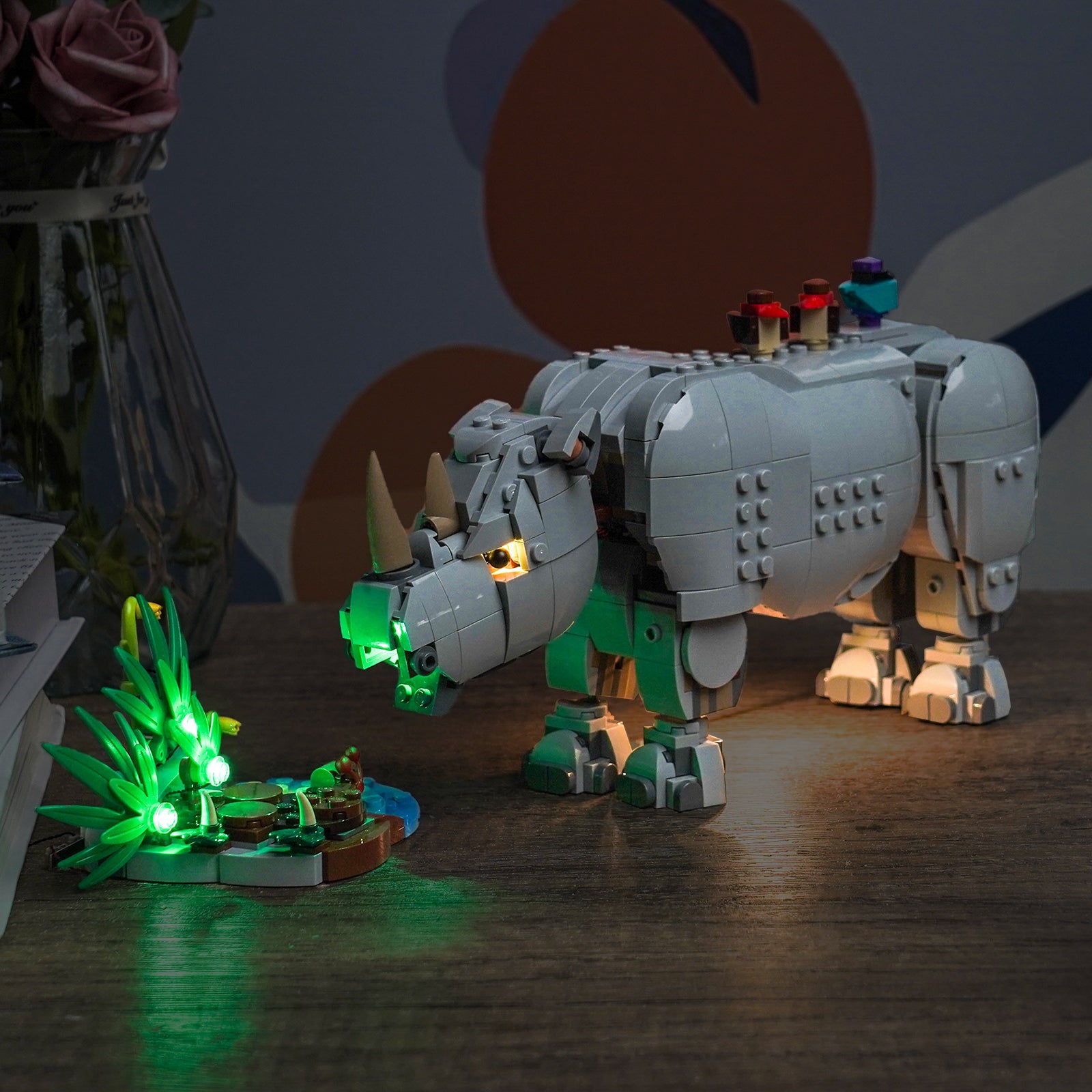 ��The BrickBling exclusive lighting kit transforms your LEGO 31171 "Wildlife: Majestic Rhinoceros and Birds" from an ordinary model into a vibrant nighttime jungle scene.