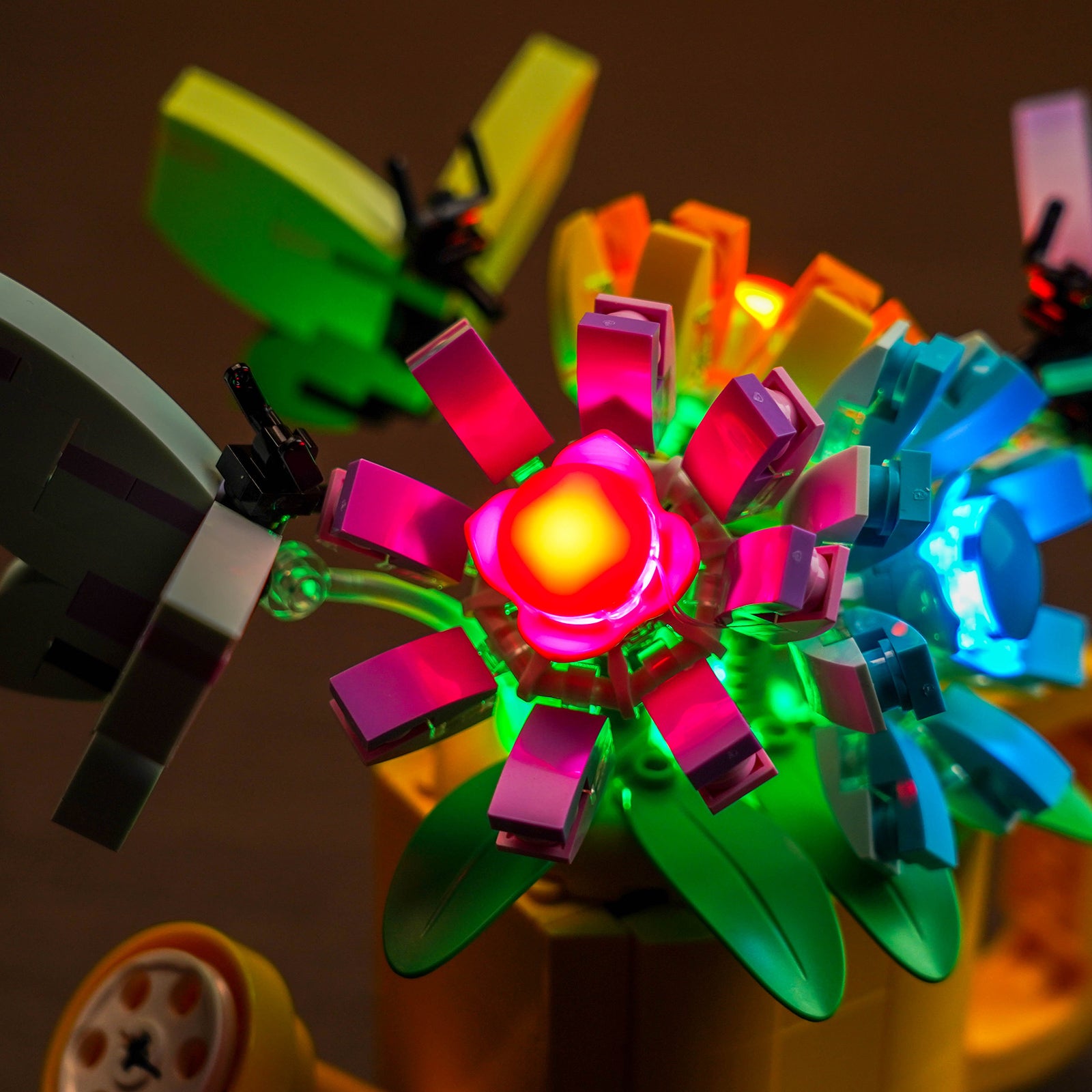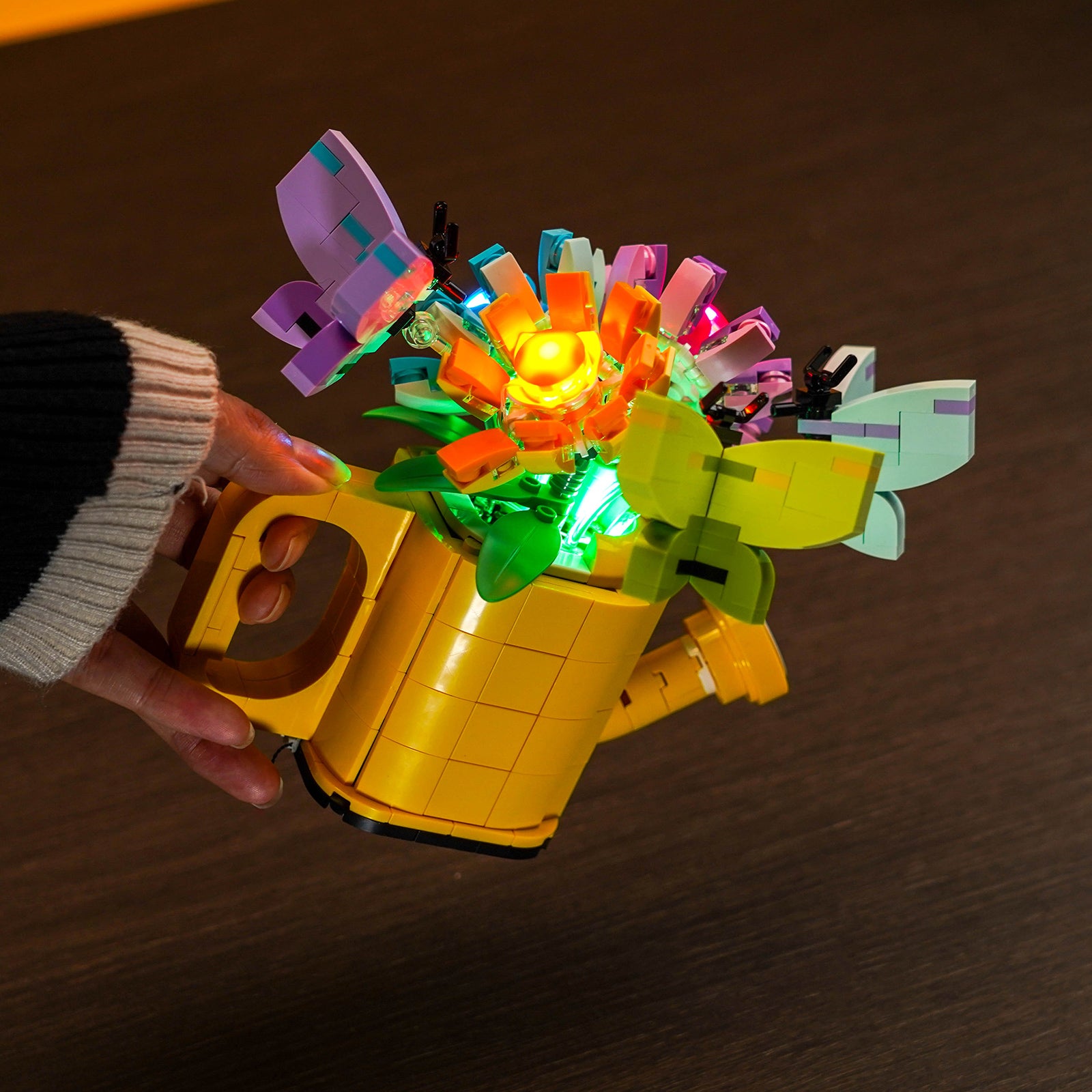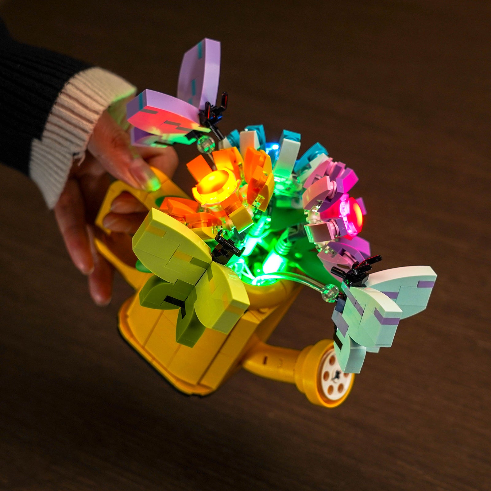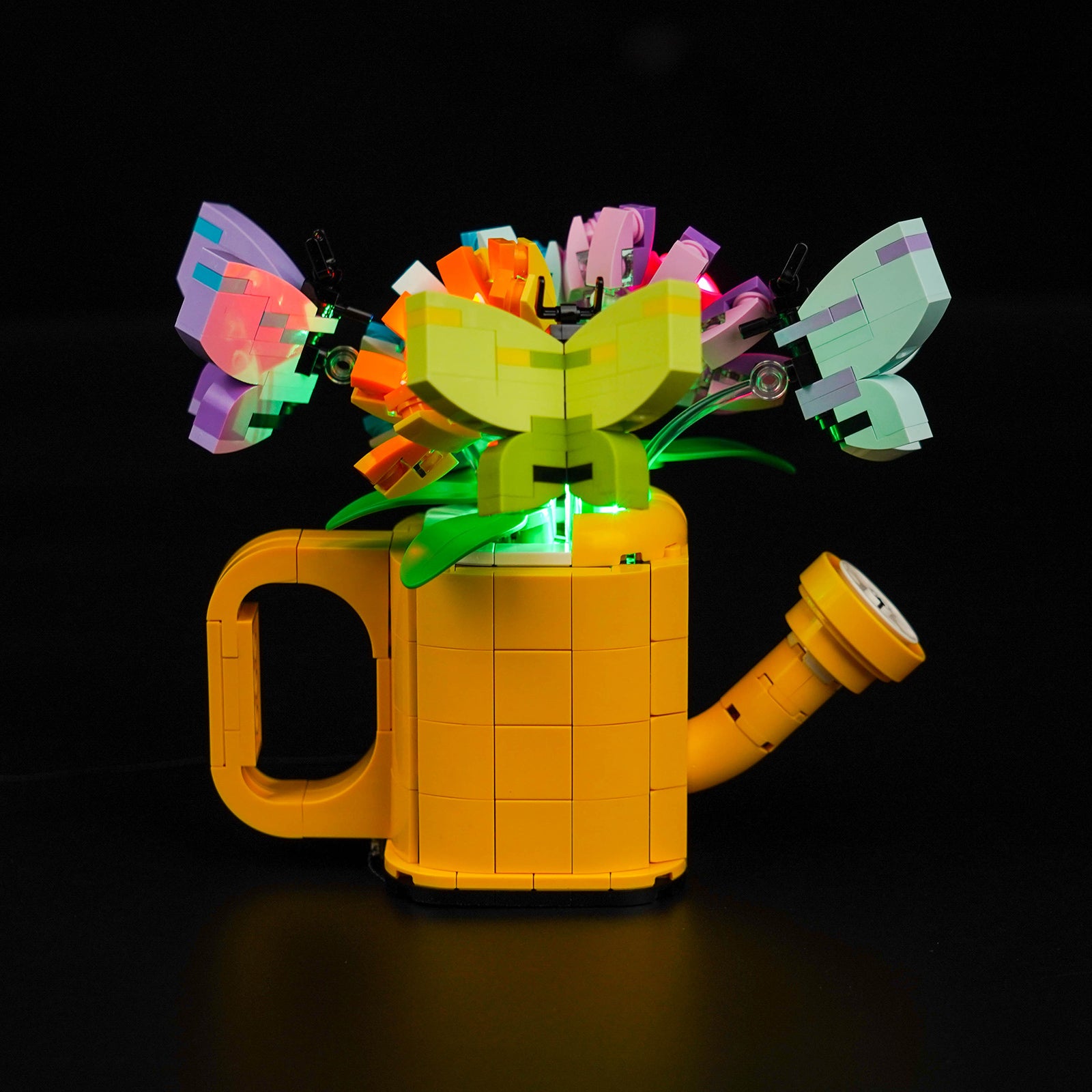 Our carefully selected green, cyan, orange, and pink LEDs blend subtly into your LEGO Flowers in Watering Can, turning it into a mesmerizing display of elegance. Each petal and leaf comes alive with a touch of radiant brilliance, creating a soft and warm ambiance that transforms your LEGO creation into a botanical masterpiece.