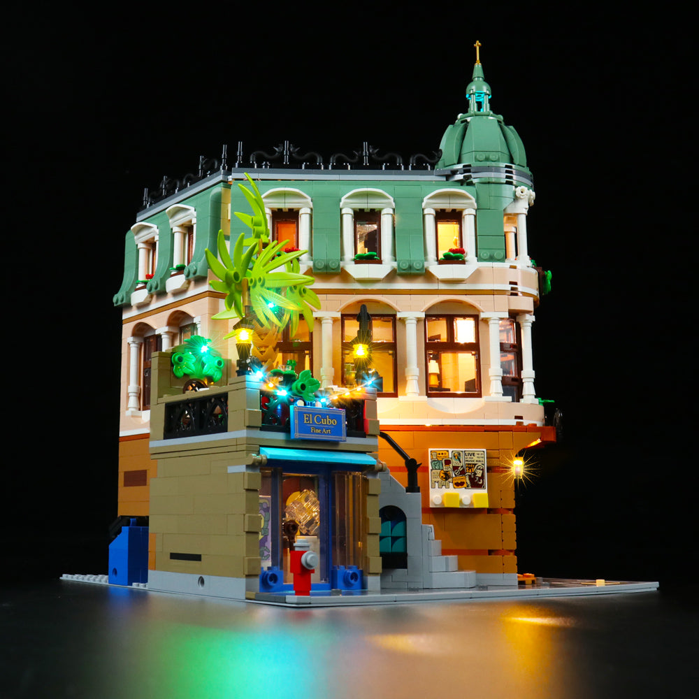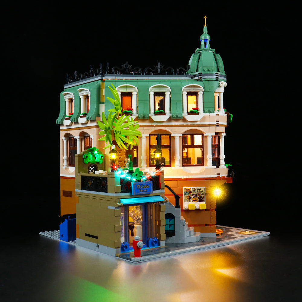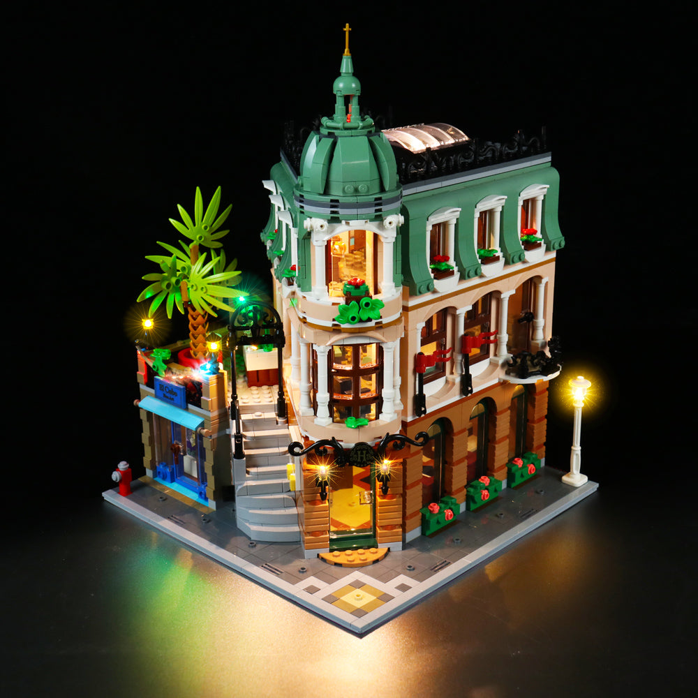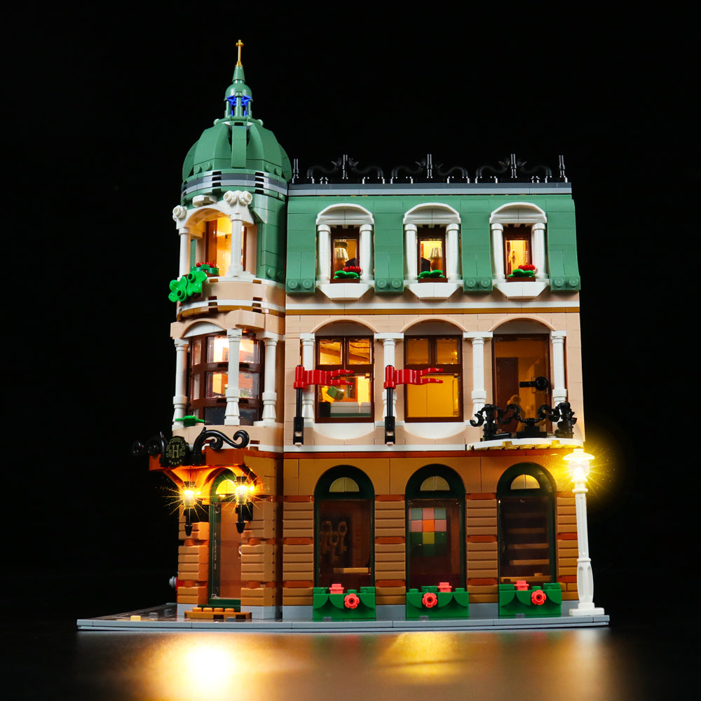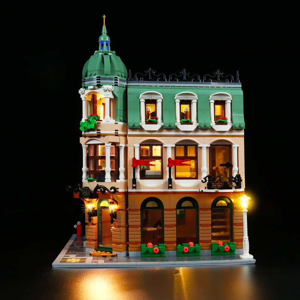 The BrickBling Light Kit gives LEGO Icons Boutique Hotel 10297 a unique charm, finding elegance in turn-of-the-century European architecture.