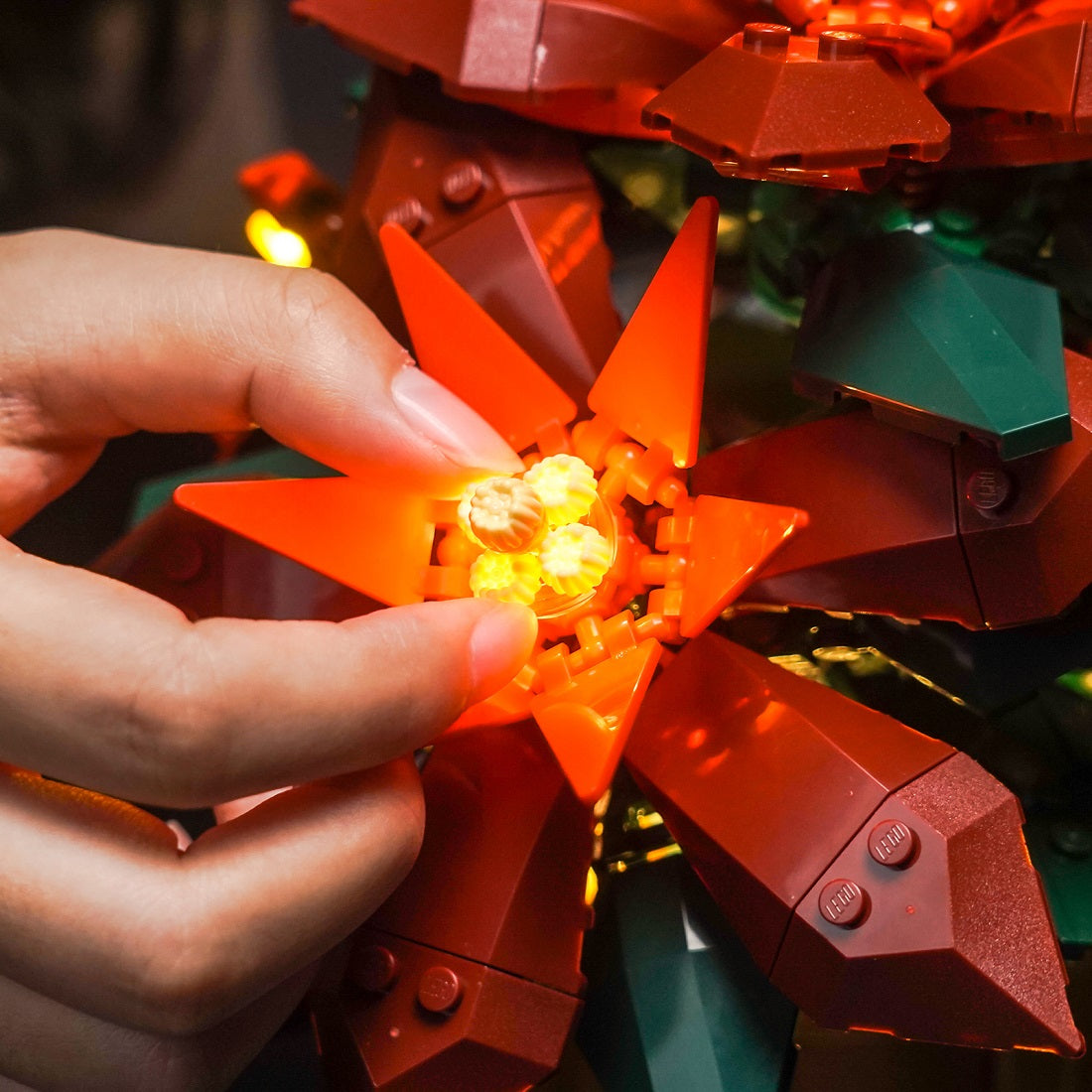 This LED light kit is compatible with the LEGO Icons Poinsettia 10370 set. Join BrickBling in illuminating a realistic 'Grande Italia' poinsettia in a woven basket planter.