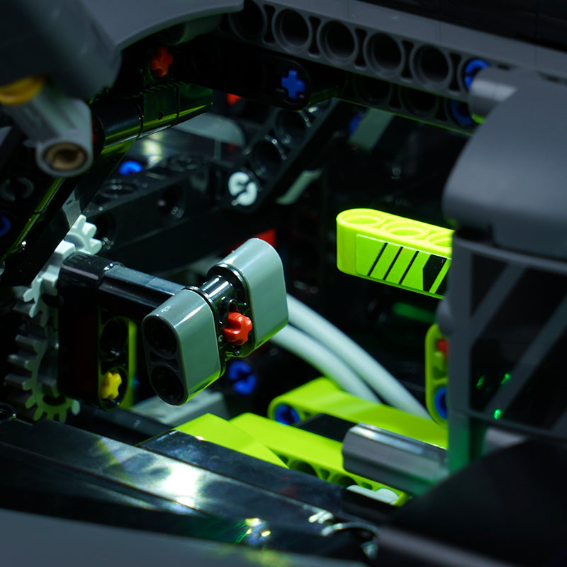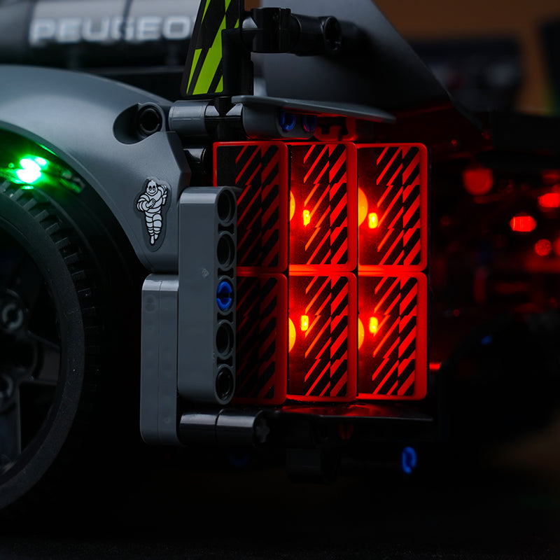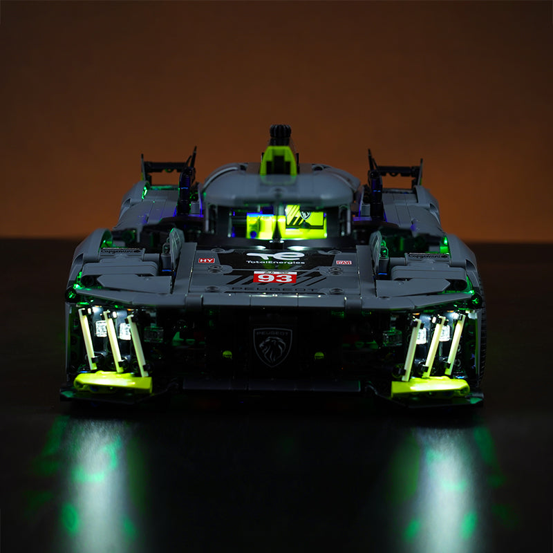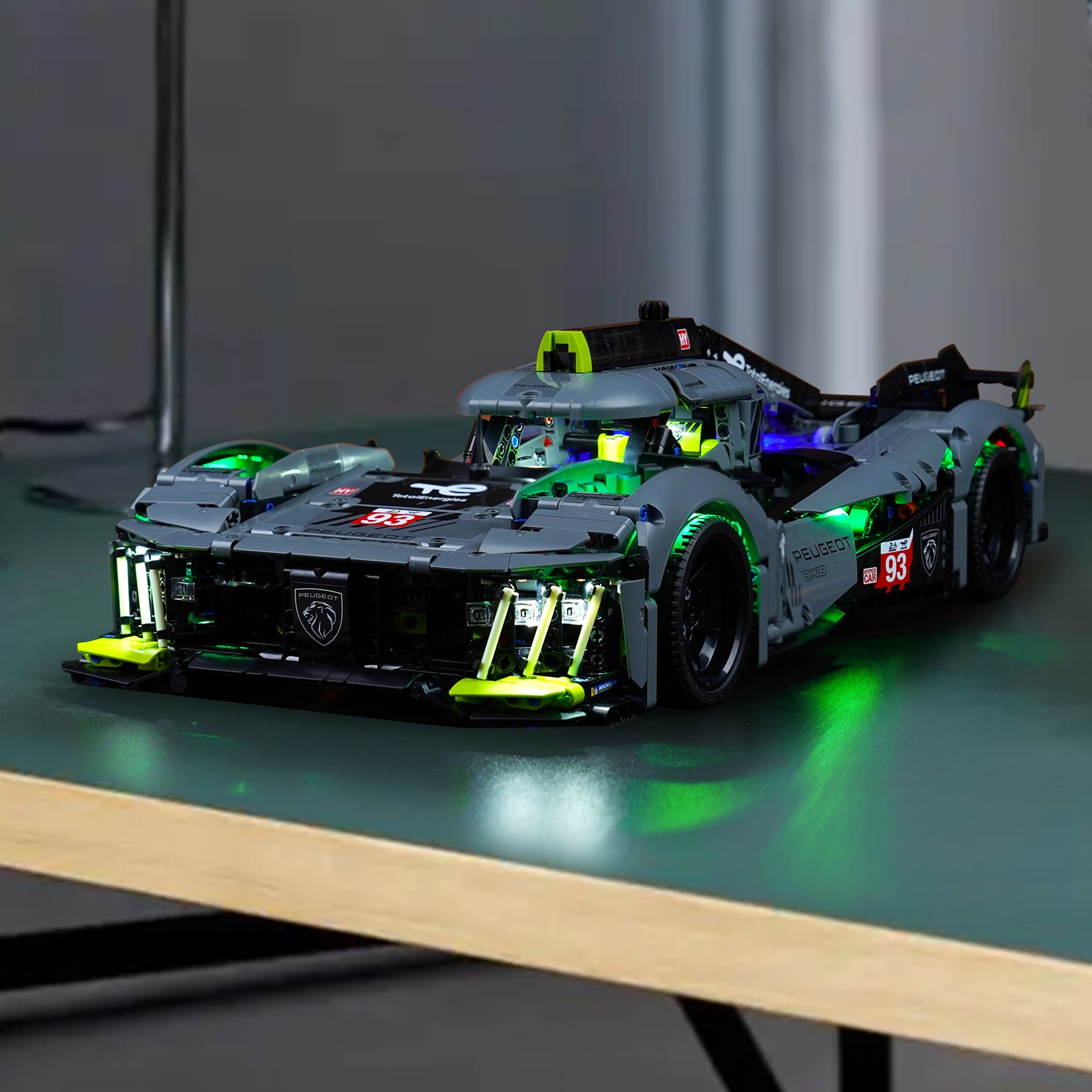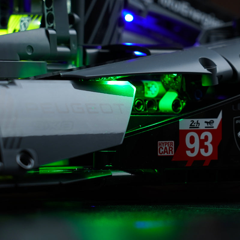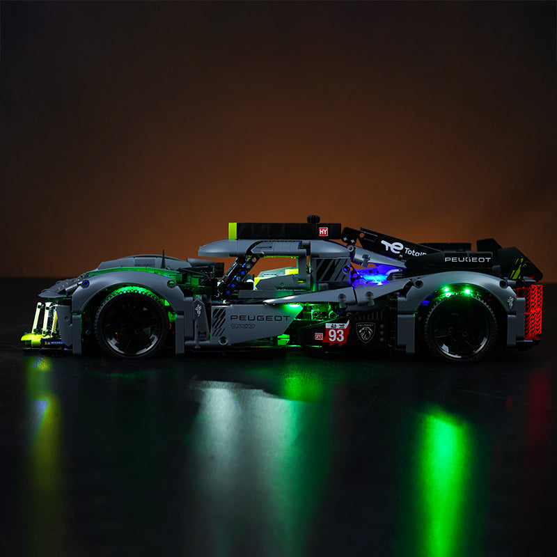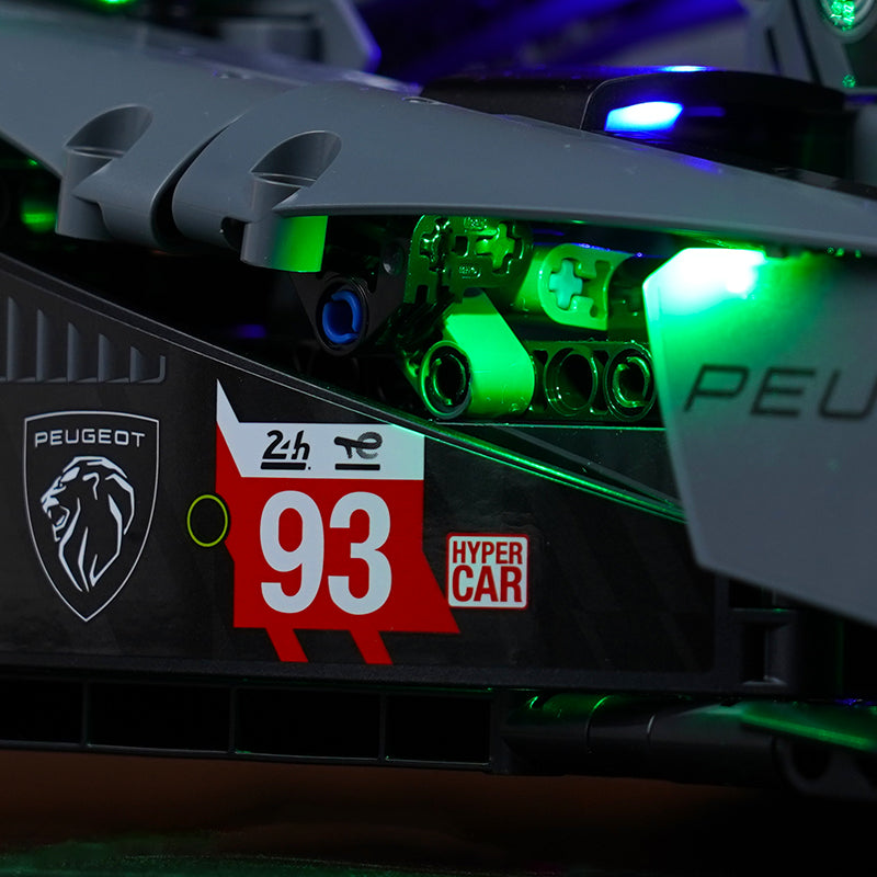 This lighting kit is designed especially for the thrilling LEGO® Technic™ PEUGEOT 9X8 24H Le Mans Hybrid Hypercar 42156 and let's enjoy the night mode of the Race car model. With our BrickBling lighting system, the charming model comes alive, making it a special building toy to display!