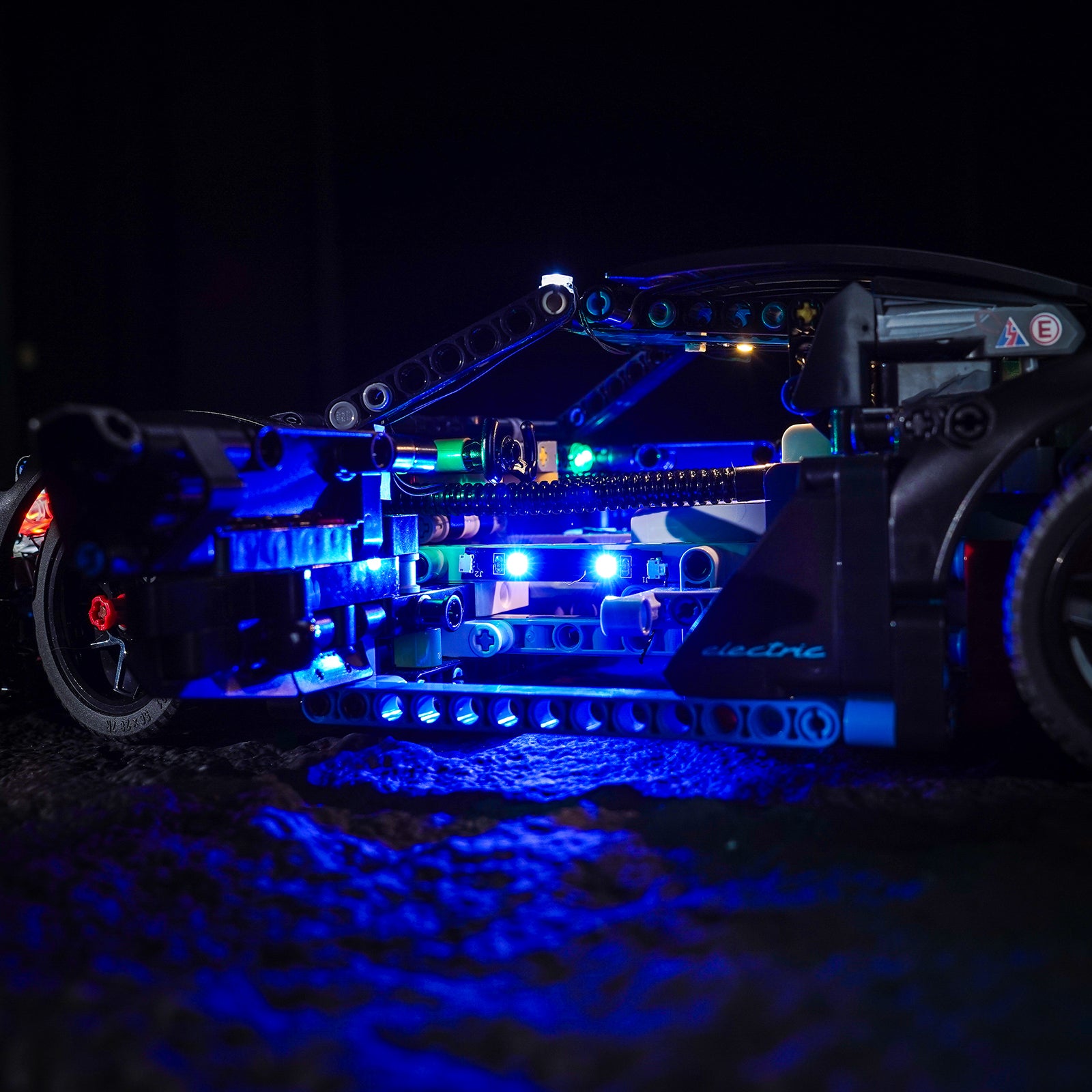 Recreate Porsche's precision engineering, including an electric drive system, independent suspension, adjustable rear spoiler, and the cockpit and seating layout of the real race car. Our LEGO lights enhance these features, from the red headlights that pierce the night to the white taillights that elegantly trace its path, not only subtly enhancing the sleek silhouette and intricate details of this race car, but also fully experiencing the thrill of precision engineering.