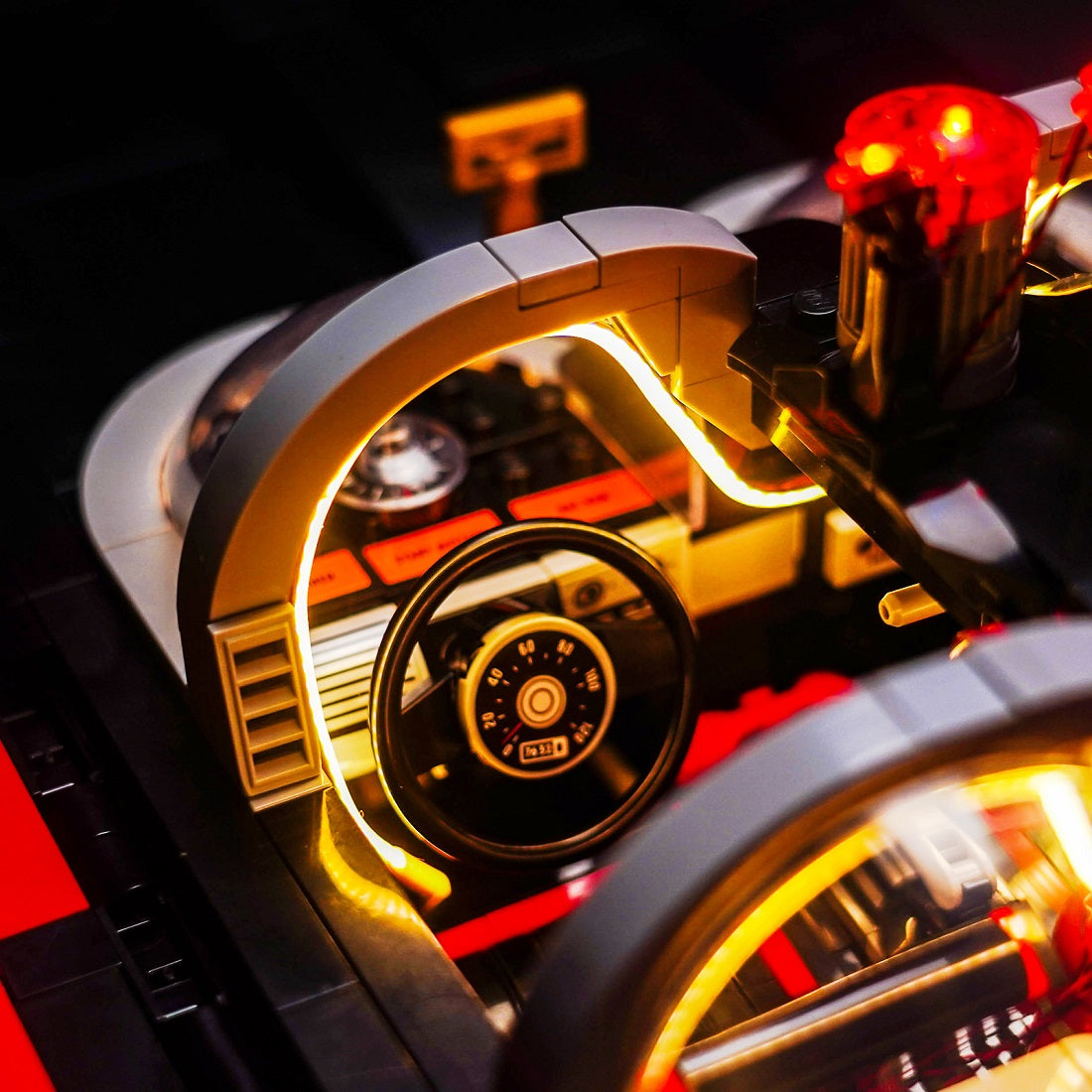 The dynamic white front headlights and the glowing red tail lights to illuminate the Batmobile’s path, adding authenticity as it speeds through the streets of Gotham. Interior cockpit lighting that enhances the realism of the Batmobile’s control panel, giving Batman the perfect ambiance for his nightly patrols.