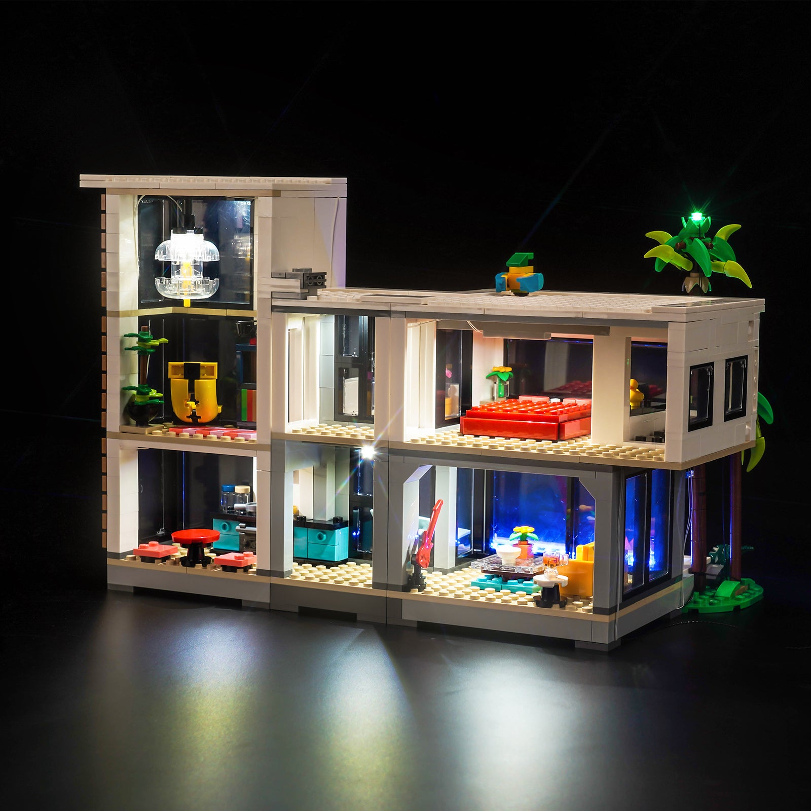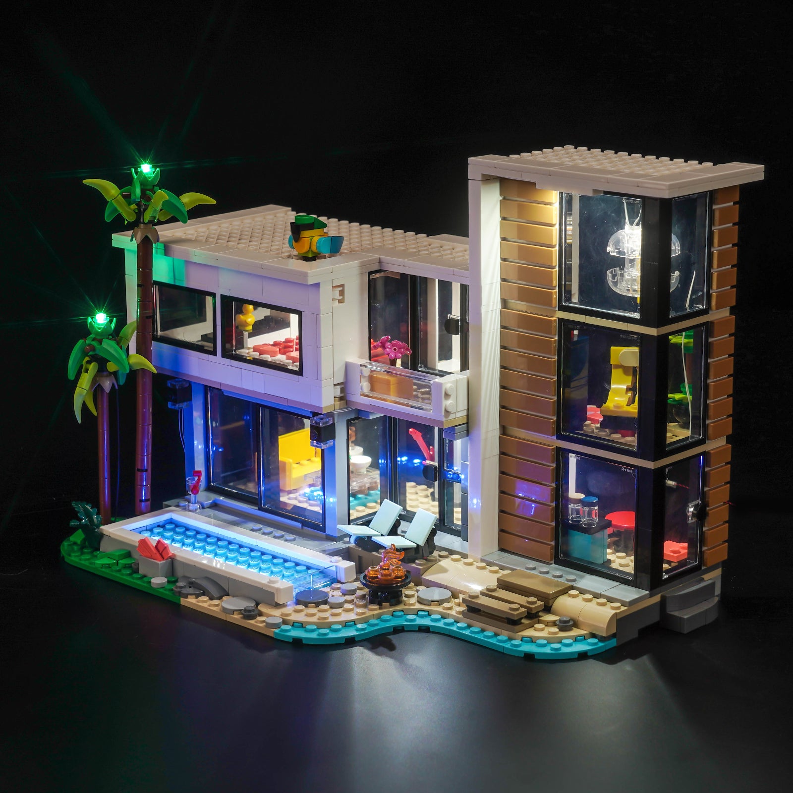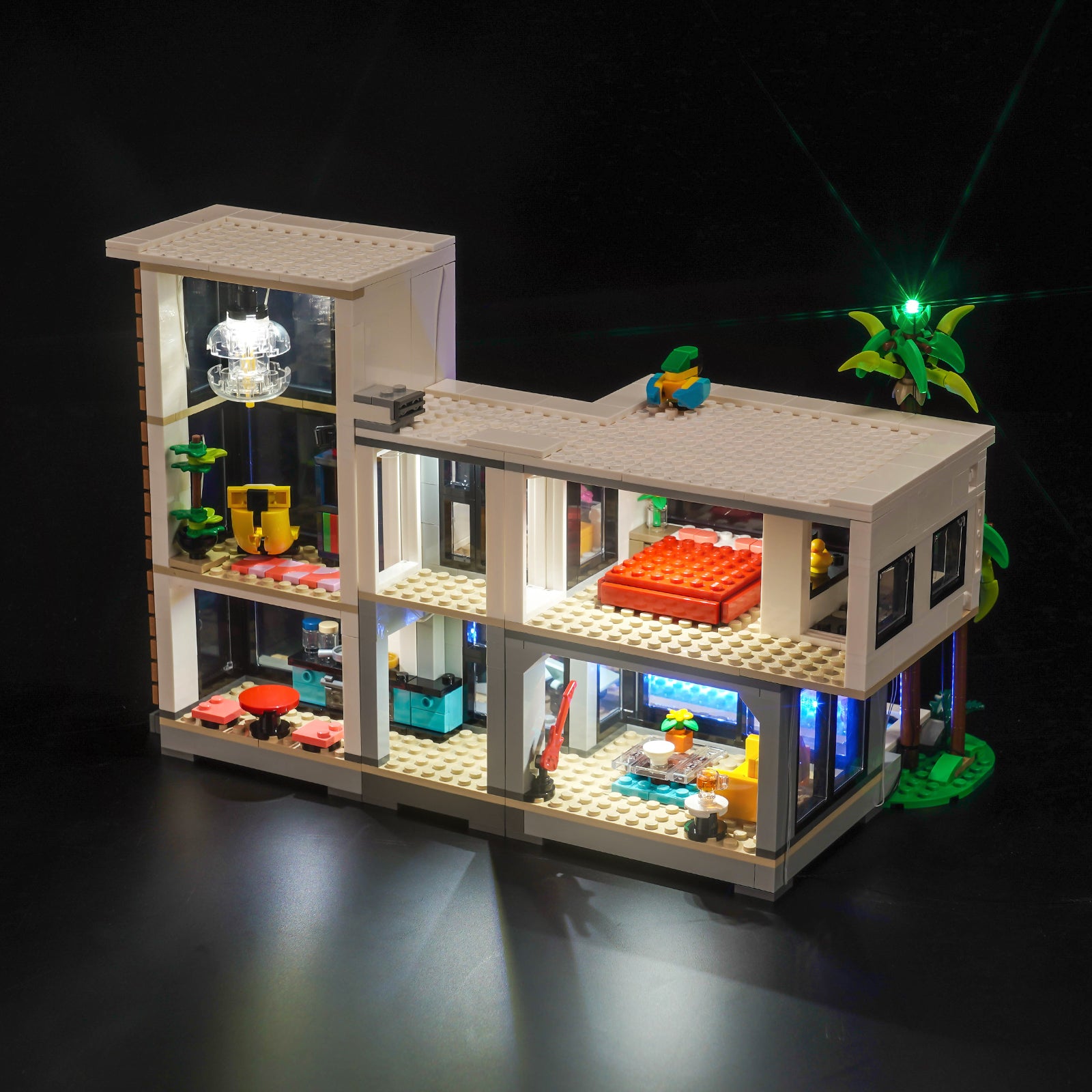 This lighting set seamlessly integrates into every room of LEGO 31153 Modern House. From the cozy living room to the elegant bedroom, to the tranquil study and towering palm trees, BrickBling makes every brick and tile shine, creating an enchanting nighttime landscape.