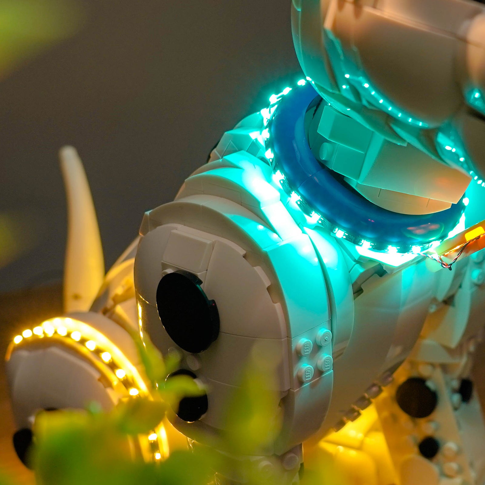 We specially use blue-white light and soft light yellow lamp beads to bring a warm atmosphere like sunshine to the dog model, creating a warm and comfortable display effect. From the dog's big eyes to the small paws, every detail is more vivid and cute under the light. Light up at night, it is like a little elf guarding your desk.