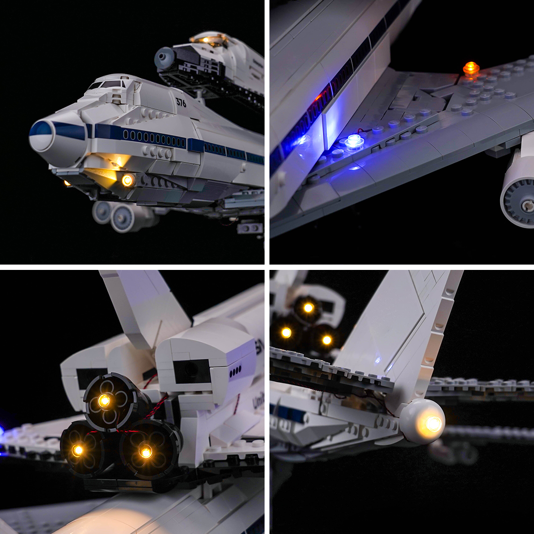 Light Kit for Shuttle Carrier Aircraft 10360 Use warm yellow light and blue-white light to combine multiple levels of lighting effects, from the glow of the space shuttle cockpit to the blue light propulsion at the tail of the transporter engine, full of details, bringing immersive visual shock.