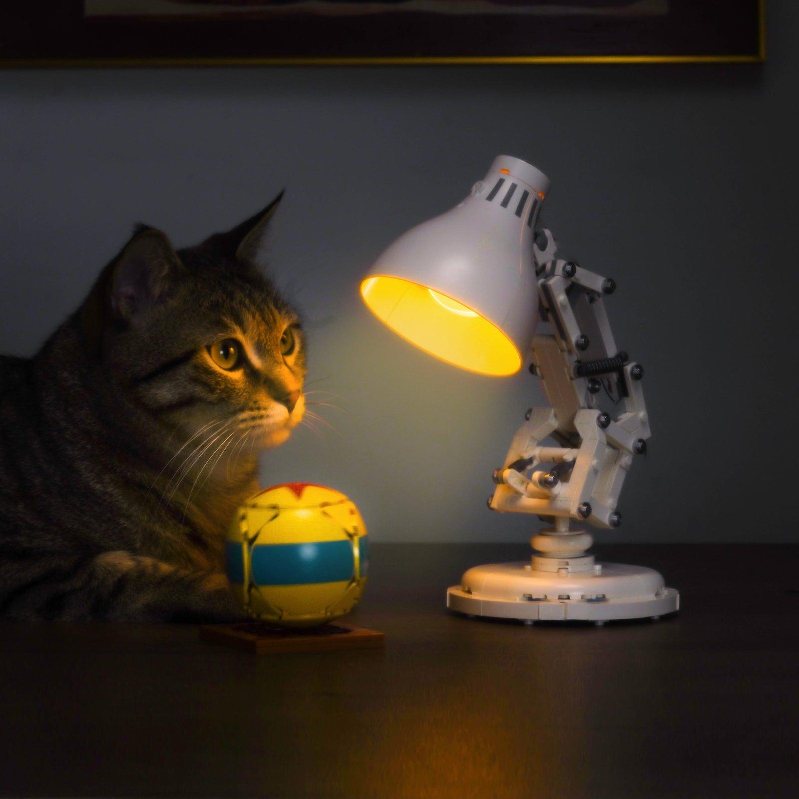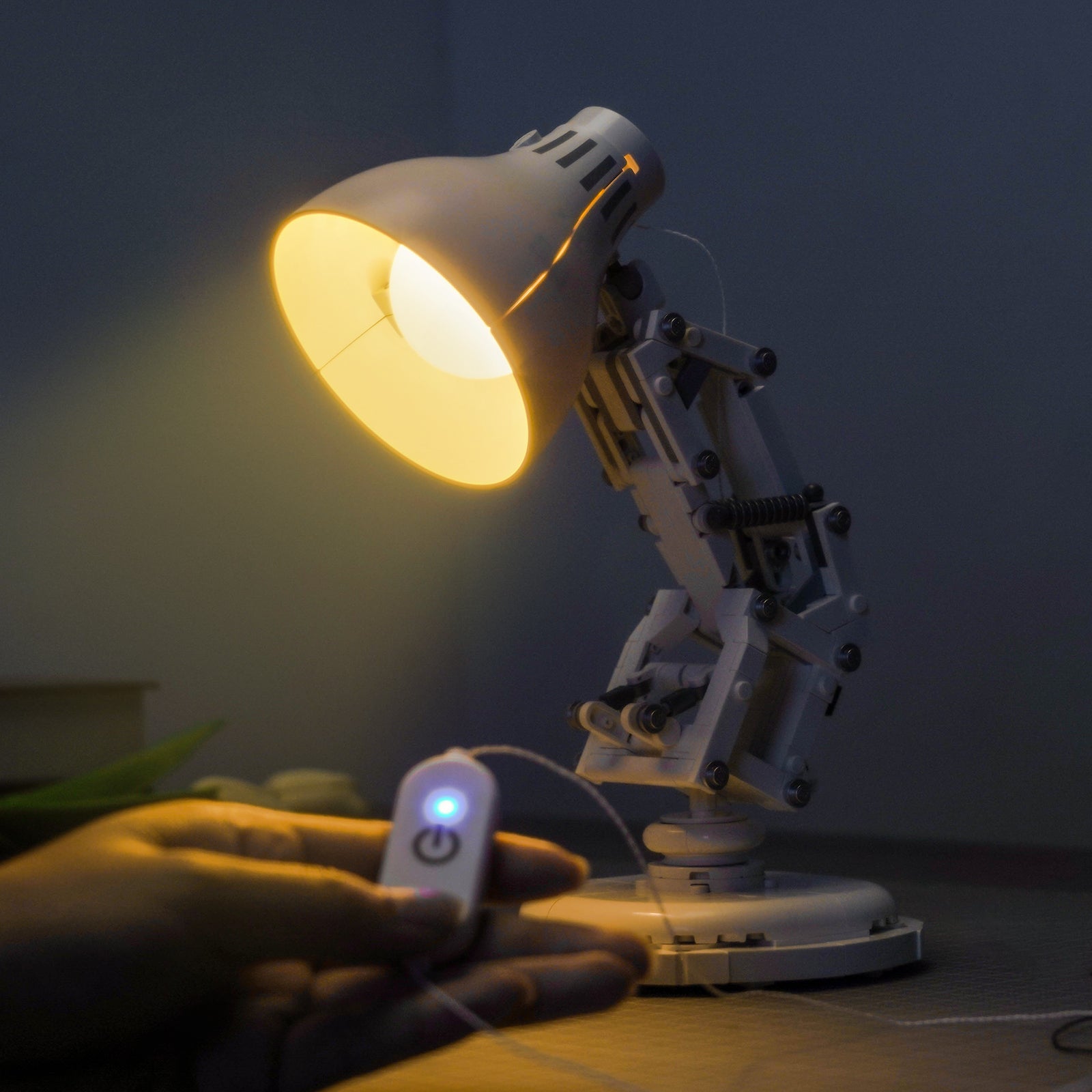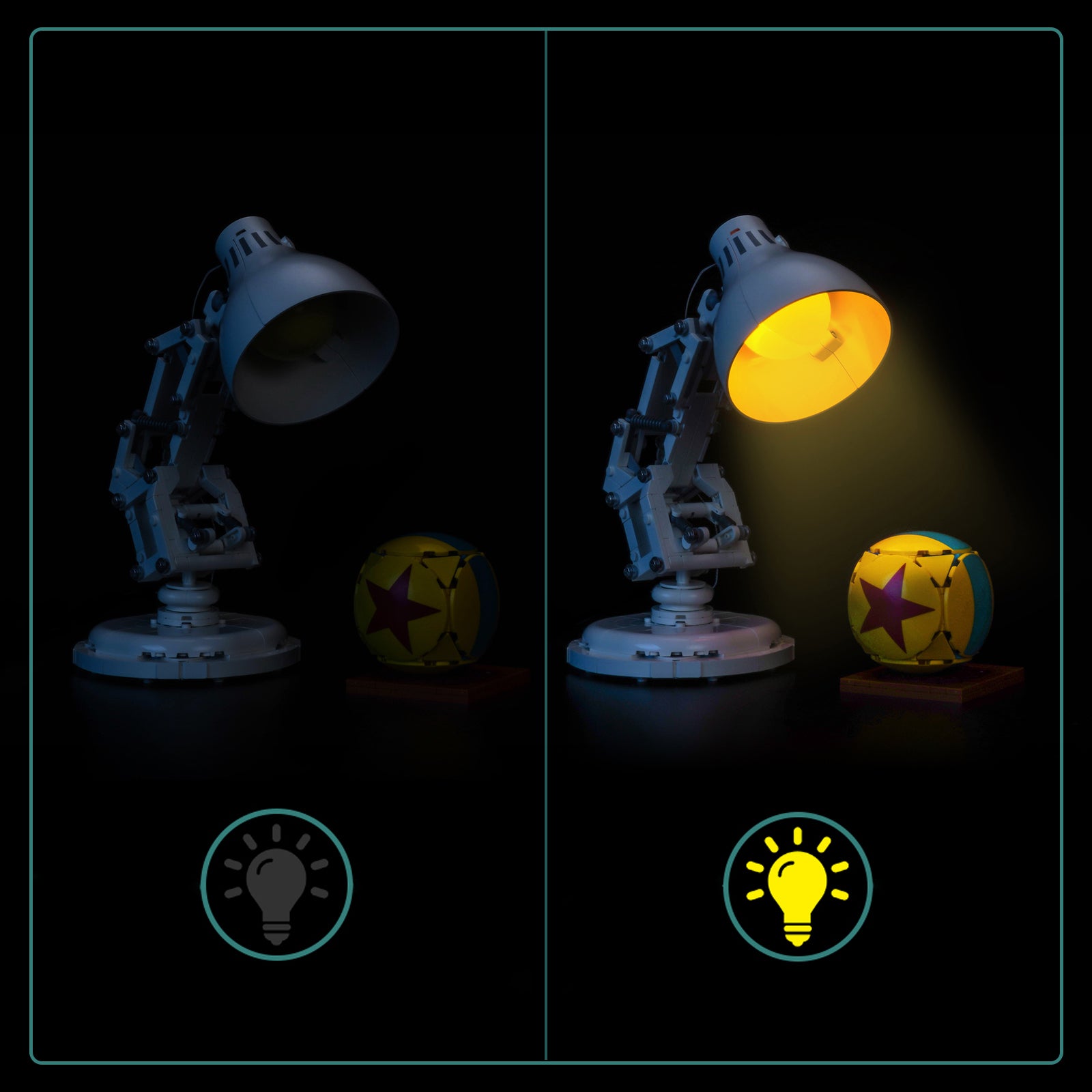 The light kit features a warm yellow glow that mimics cozy nighttime lighting. Built-in miniature LED beads are cleverly hidden inside Luxo Jr.'s lamp head, creating a realistic and immersive illumination effect that enhances the mood and brings the iconic Pixar scene to life.