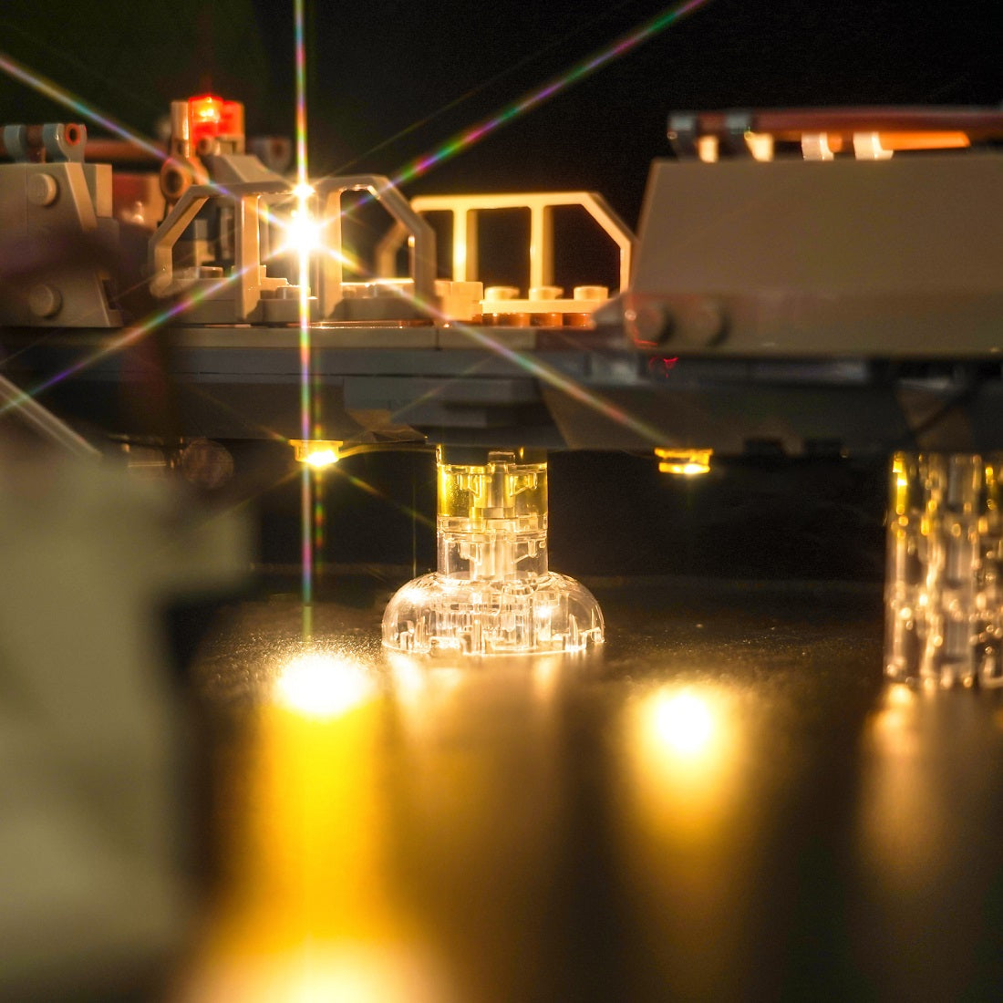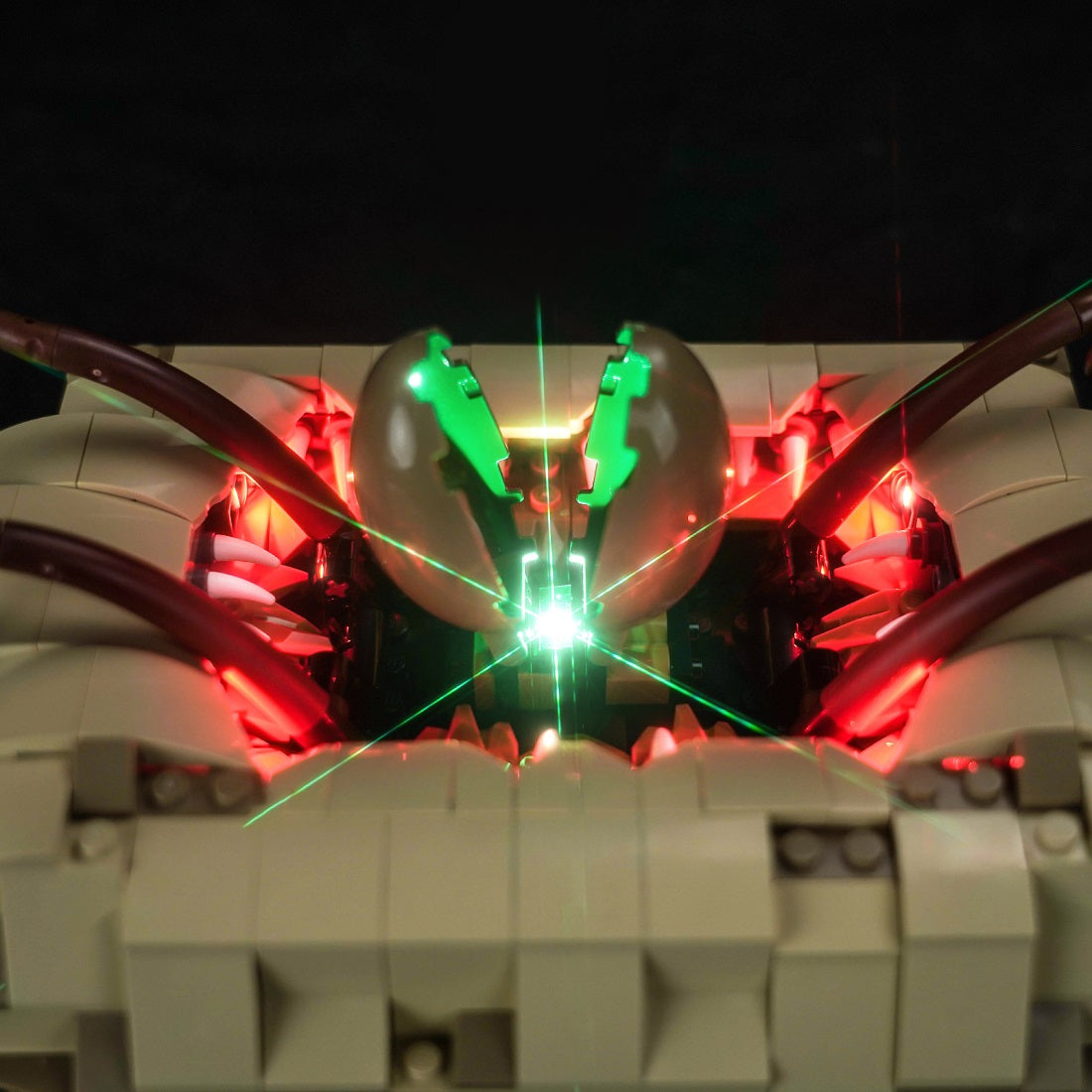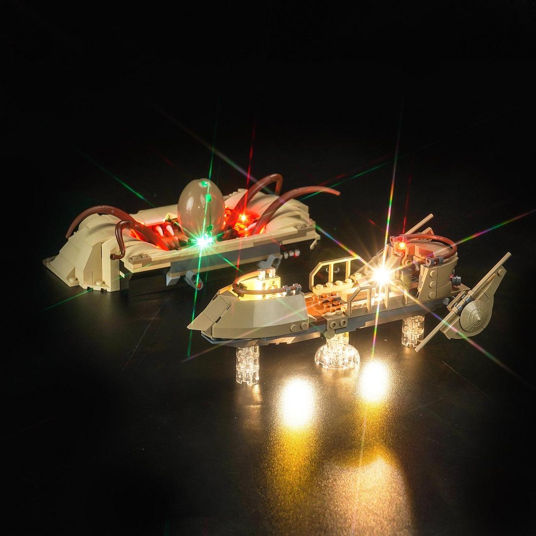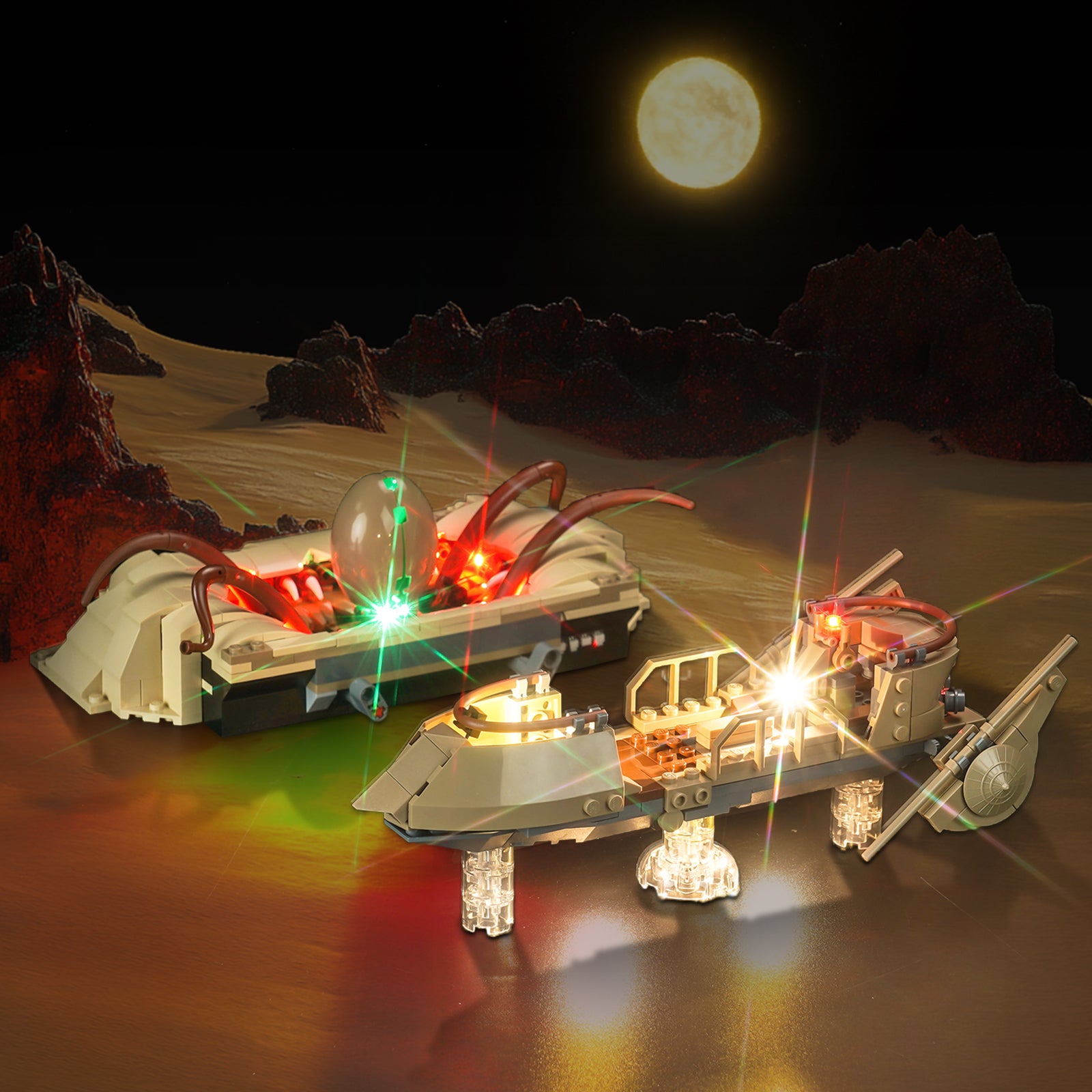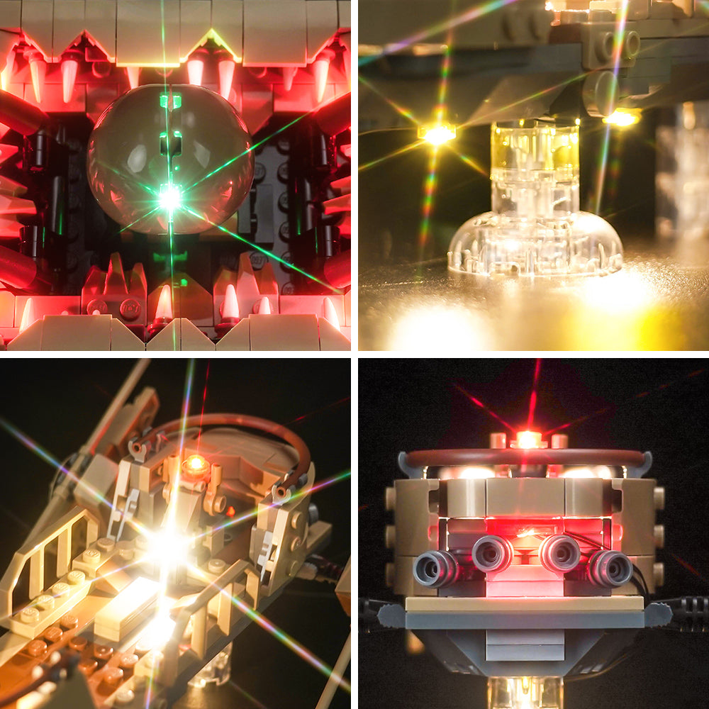 The skiff, where heroes and villains face off, is highlighted with warm white LED lights that give it a dynamic, hovering effect. The control panel and edges of the skiff are subtly lit, adding realism and depth to the model. As the skiff hovers over the gaping Sarlacc Pit, the LEDs within the pit itself create an eerie, ominous red and green glow, emphasizing the lurking danger below.
