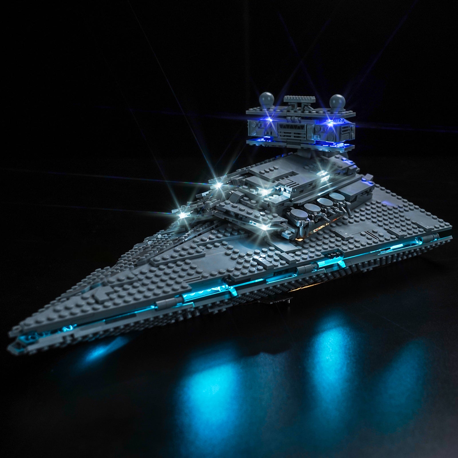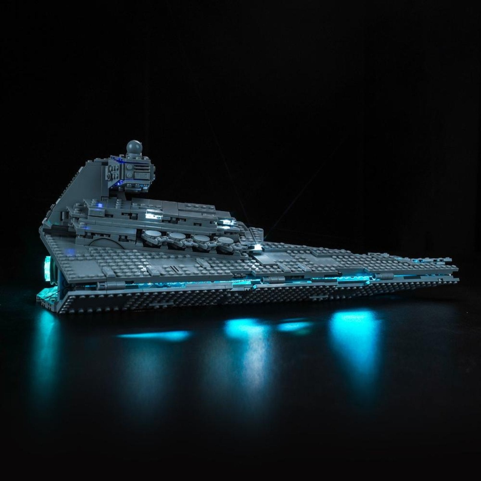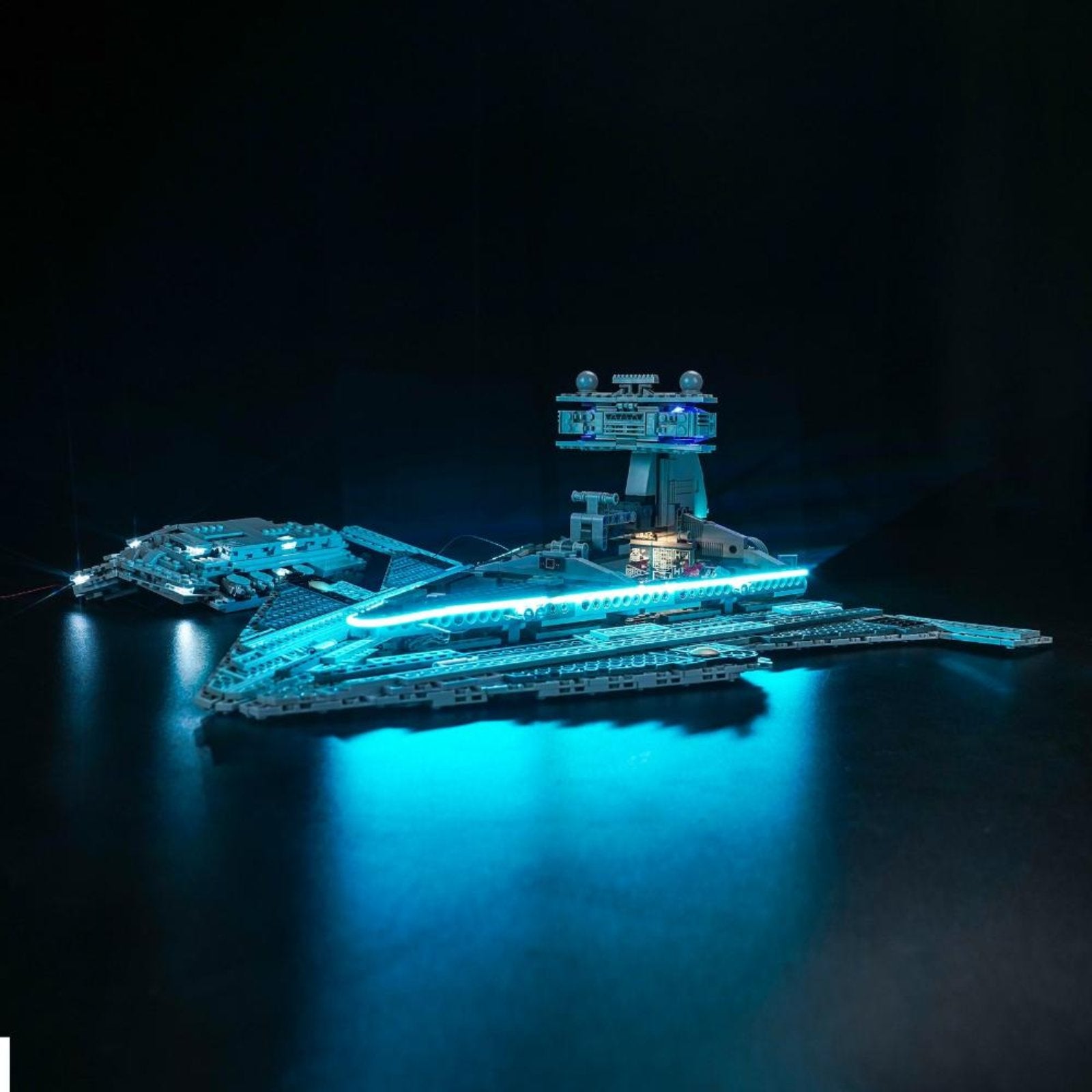 The Imperial Star Destroyer is a symbol of the Imperial fleet, representing power and domination, and is one of the most impressive warships in the Star Wars universe. Our carefully adjusted lighting perfectly matches the structure of the Imperial Star Destroyer, making the details of key parts such as the bridge, conning tower, radar dish and thrusters shine in blue and cyan light, highlighting its deterrent power.