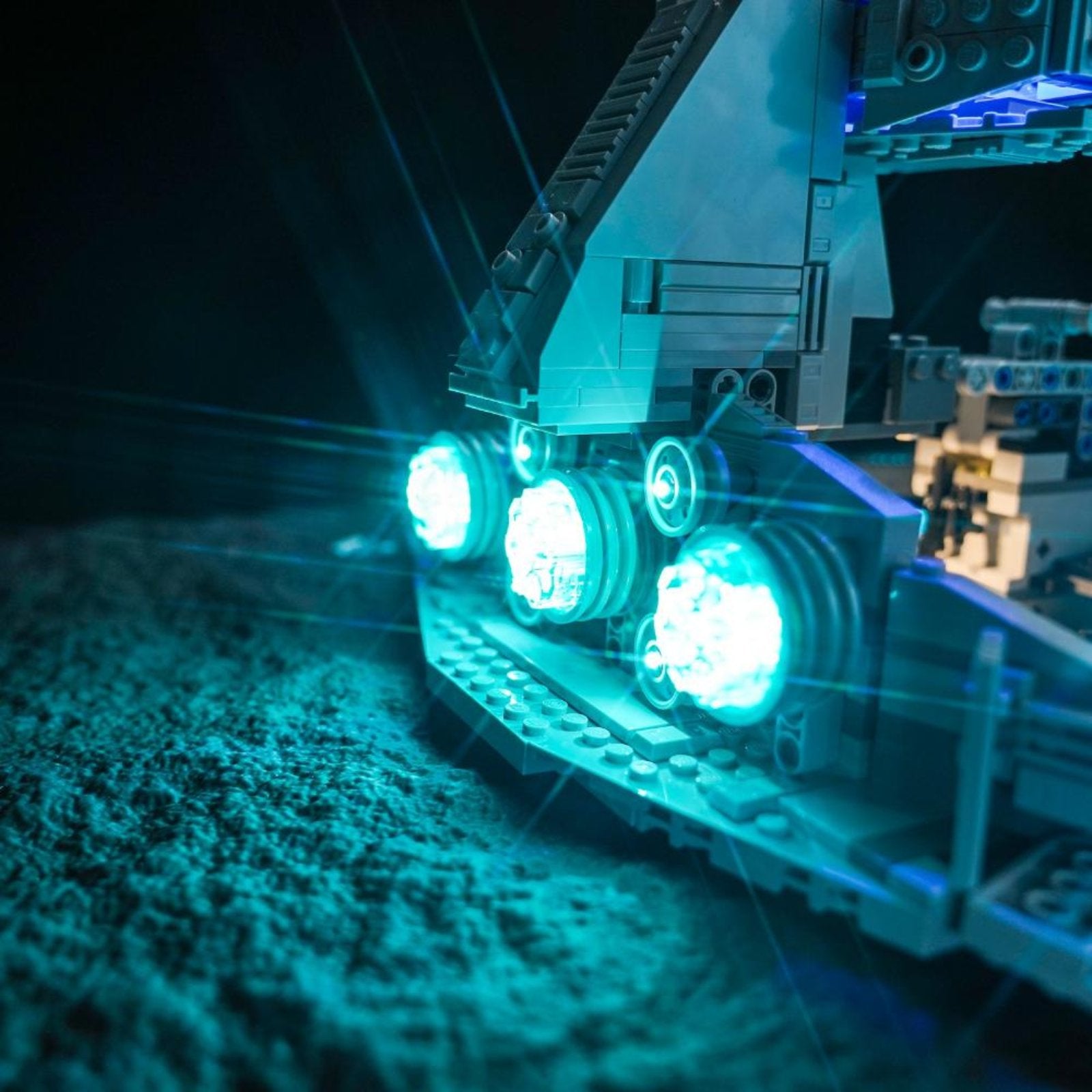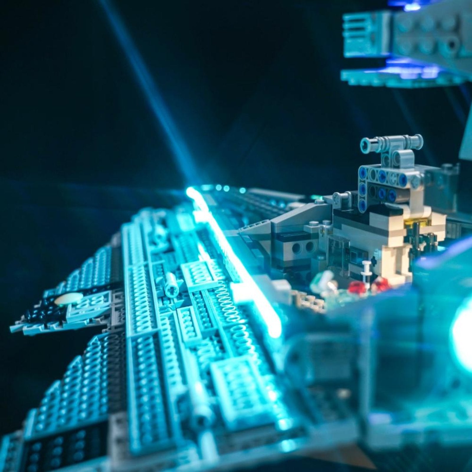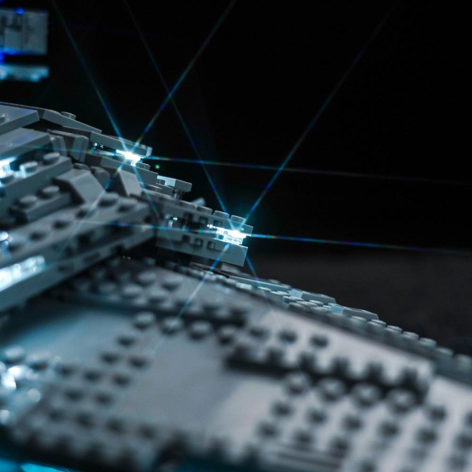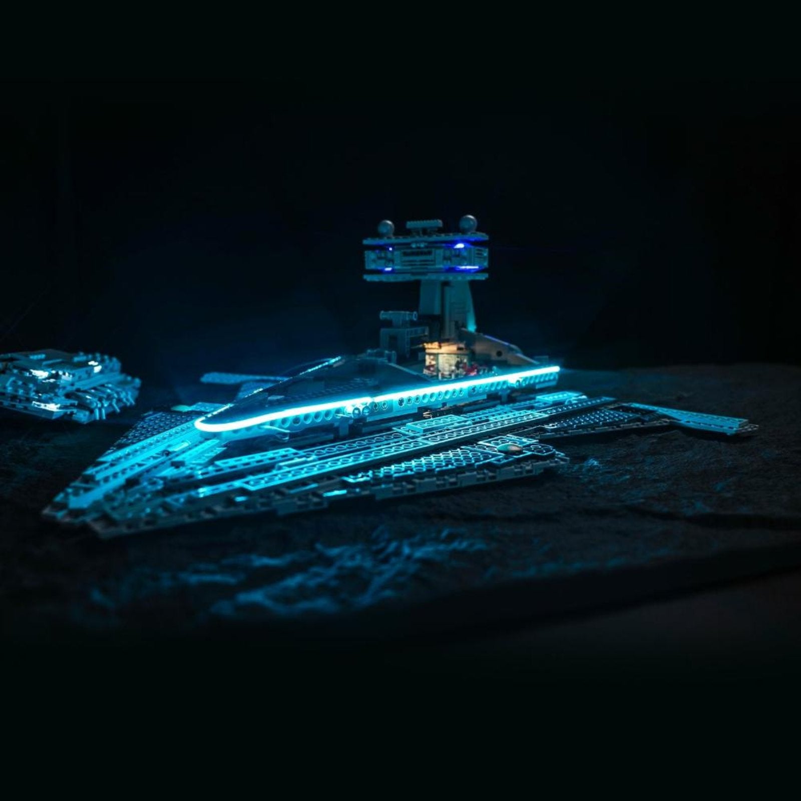 The Imperial Star Destroyer is a symbol of the Imperial fleet, representing power and domination, and is one of the most impressive warships in the Star Wars universe. Our carefully adjusted lighting perfectly matches the structure of the Imperial Star Destroyer, making the details of key parts such as the bridge, conning tower, radar dish and thrusters shine in blue and cyan light, highlighting its deterrent power.