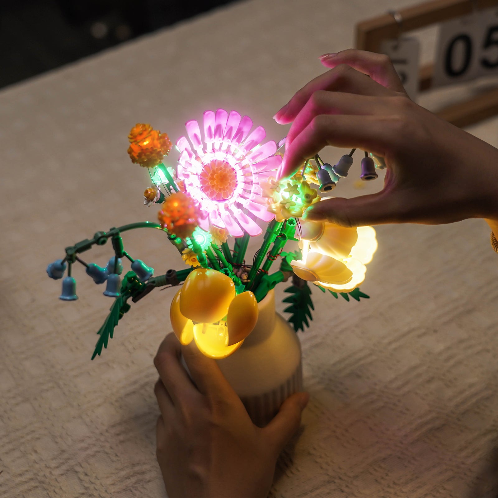 With the help of BrickBling lighting kit, this cute Sunny Bouquet will not only bloom during the day, but also shine at night.